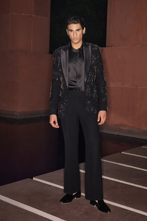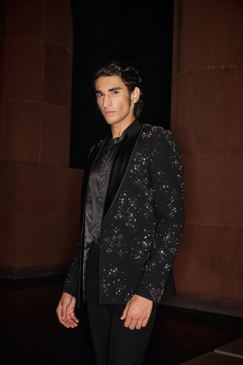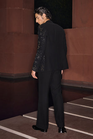 A striking embellished jacket featuring geometric motif, adorned with shimmering crystals and stones, paired with pants and embellished shirt