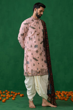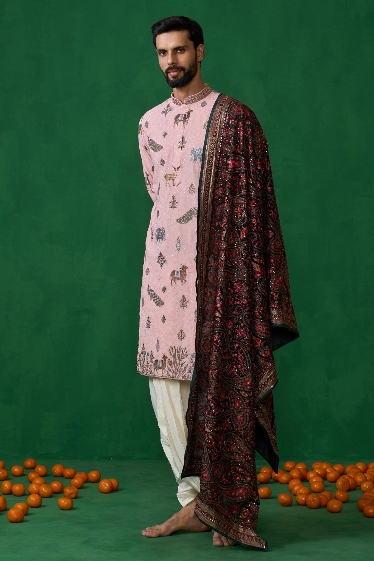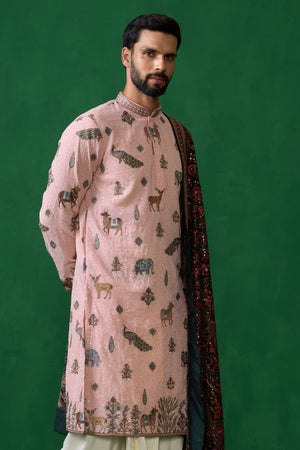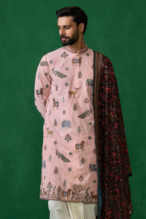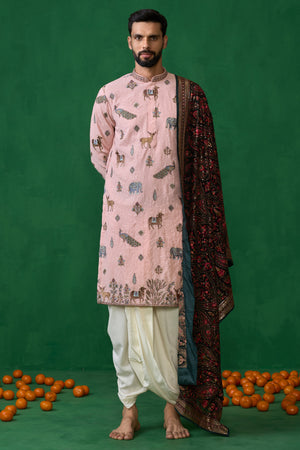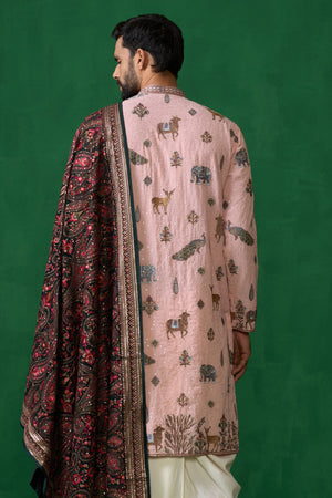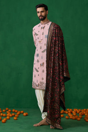 This kurta set is a stunning ensemble that perfectly blends traditional artistry with a modern silhouette. The central piece is a long kurta adorned with intricate Pichwai motifs, featuring figures of animals like elephants and deer, along with other traditional elements. These motifs are meticulously embroidered across the entire kurta, creating a rich and detailed surface. The set includes a graceful, patiyala bottom, offering a classic silhouette. A contrasting stole with a complementary pattern is draped over the shoulder, adding another layer of texture and visual interest. This outfit is a beautiful representation of cultural heritage, making it an ideal choice for formal events and celebrations.