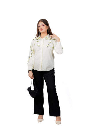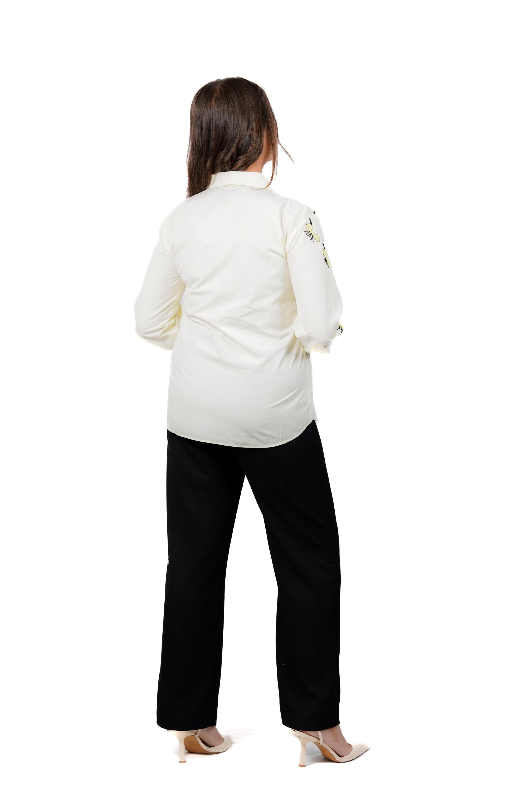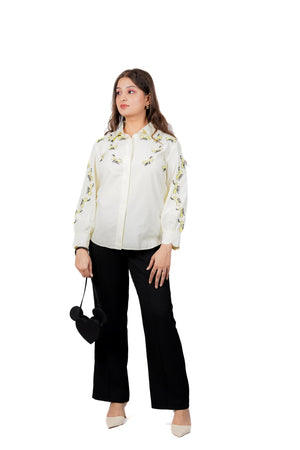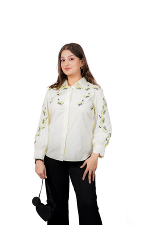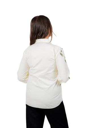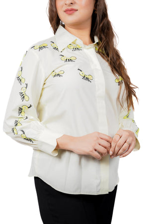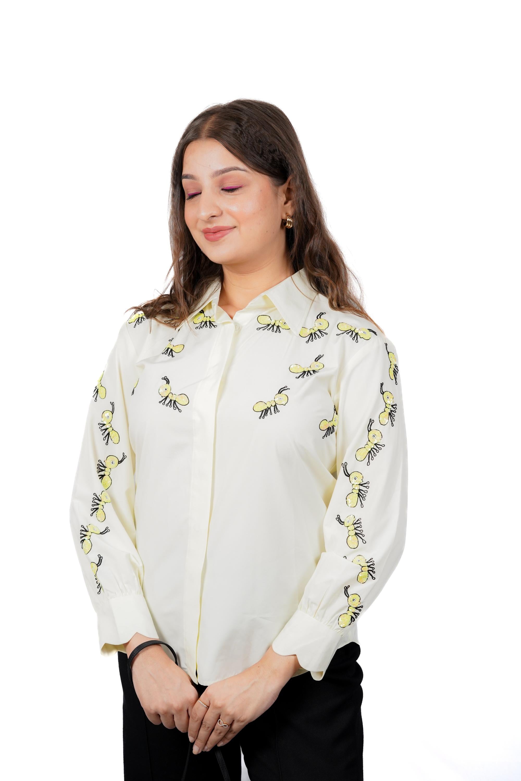 Our Pinacolada shirt features a classic shirt collar and concealed front button closure. Finished with an elasticated cuff and hand embroidered Ants.