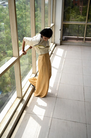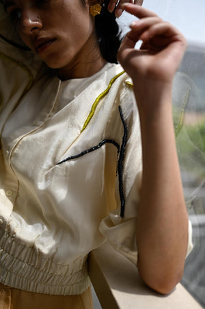 Front closure short jacket hand embroidered with PVC cord, elasticated hem and elbow length kimono Sleeve