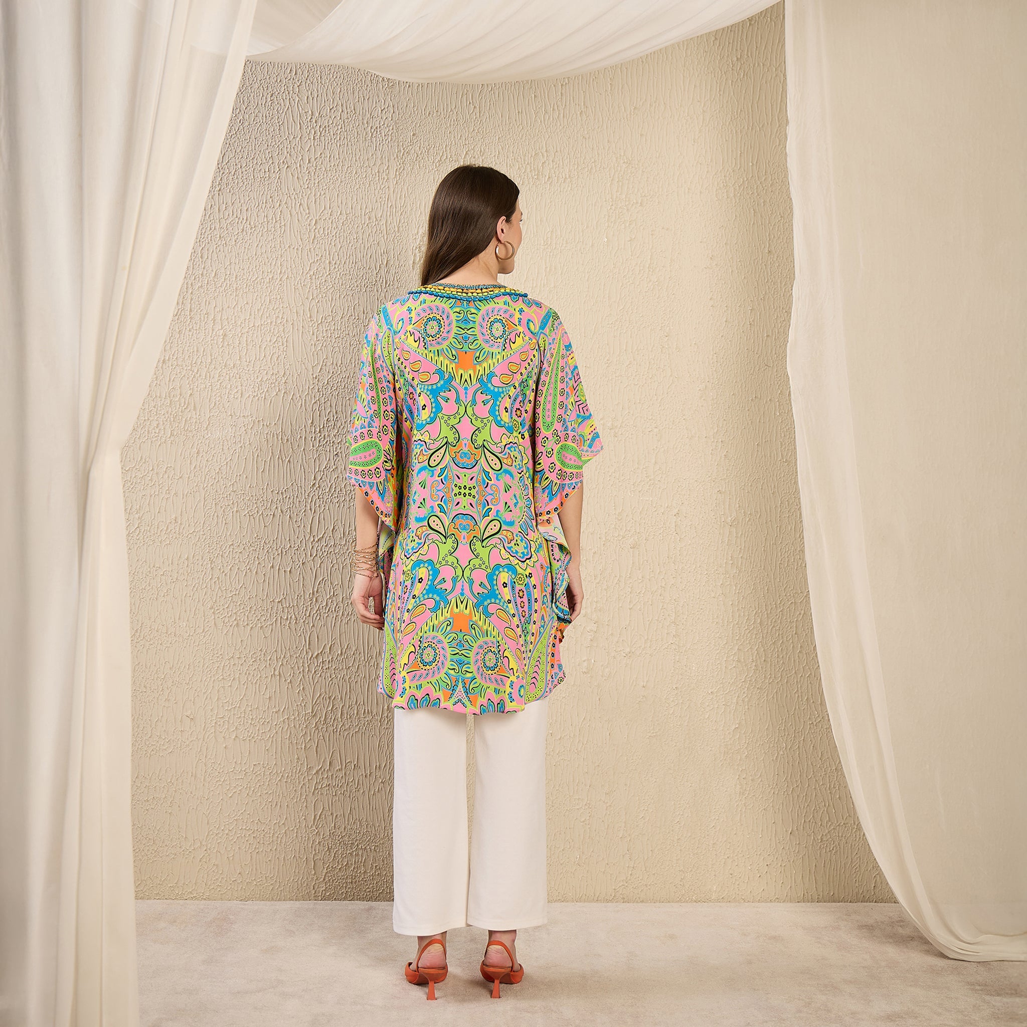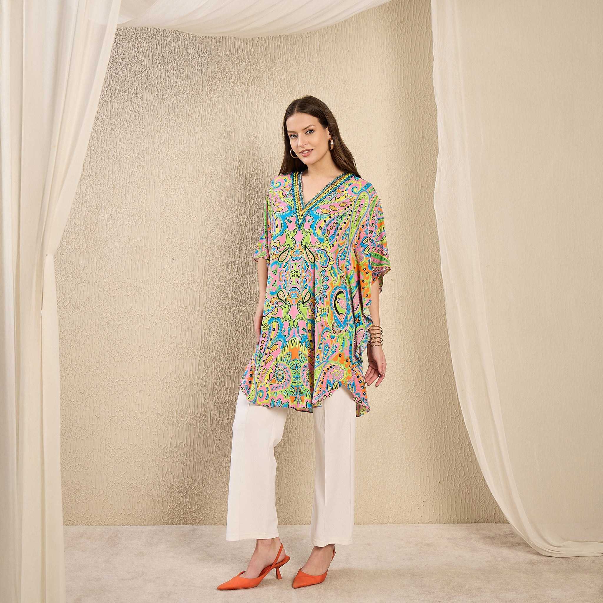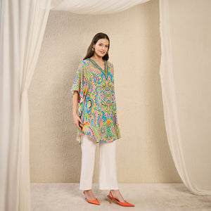 Style Guide Infuse bohemian flair into your wardrobe with our paisley printed tunic adorned with delicate bead hand embroidery on the neckline. For a daytime look, pair it with denim jeans, and slip into comfy sandals. Let the intricate beadwork stand out by keeping accessories minimal. Transition seamlessly into the evening by swapping out the shorts for tailored trousers or a into-western tulip pants, adding heels for an elevated touch. Experiment with a wide-brimmed hat or layered bracelets to embrace the free-spirited vibe of this tunic.