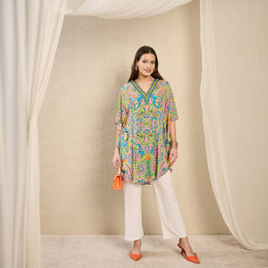 Description Modern paisley print tunic embellished with hand embroidered beadwork at the neckline. You can pair it up with tulip pants and dupatta for a statement Indo-Western look.