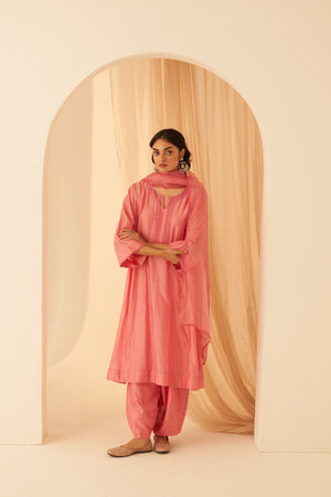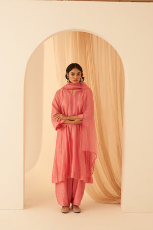A pastel yet dreamy pink Chanderi kurta, beautifully adorned with running stitch hand zardozi thread work by artisans, paired with a cotton slip, salwar, and an organza dupatta—elegant and timeless.