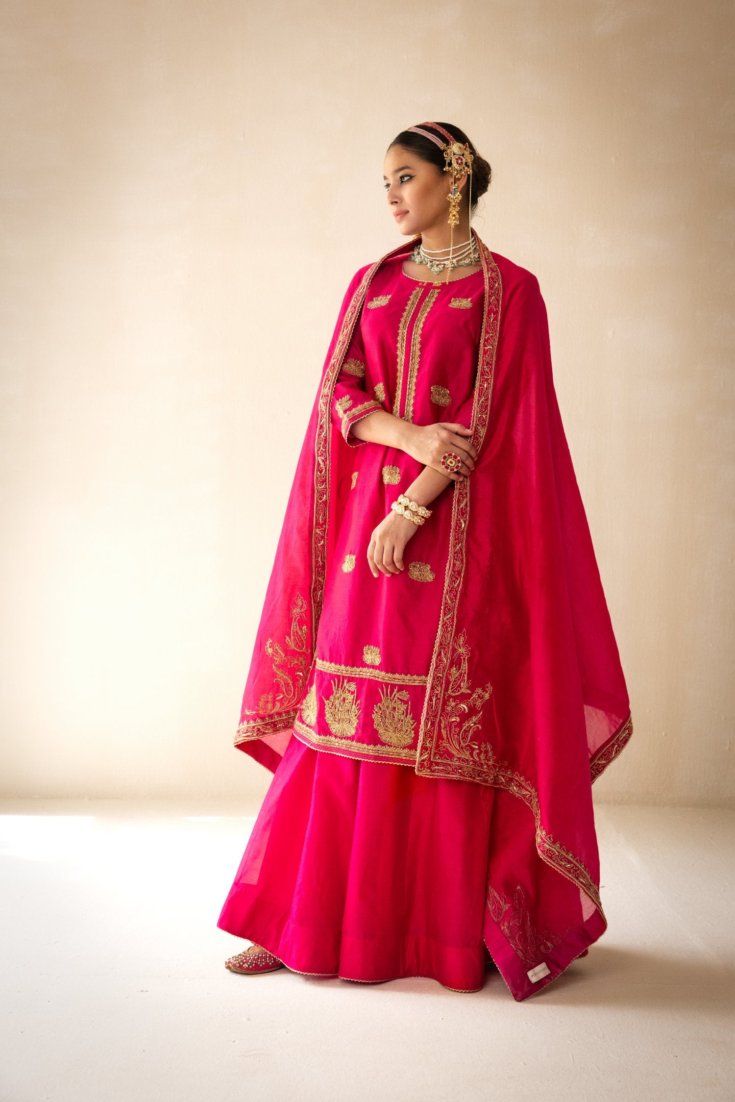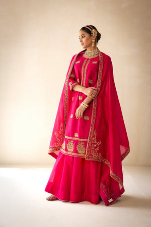 Golden embroidered kurta paired with a pink Chanderi skirt and matching dupatta, featuring intricate golden embroidery