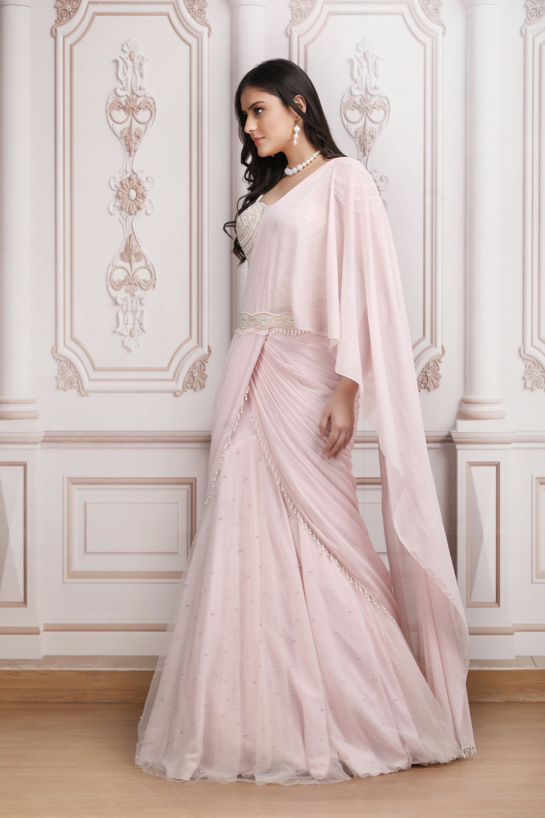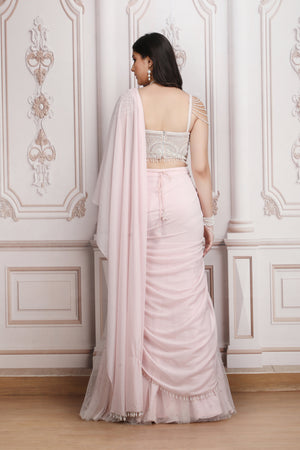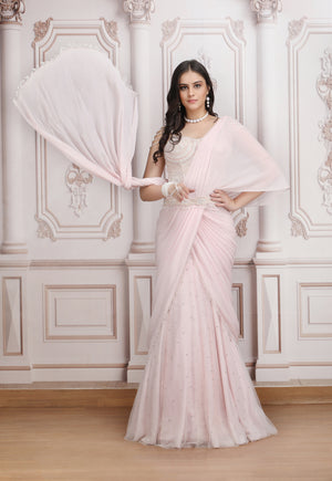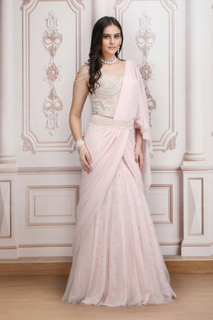 Radiate grace in this blush pink pre-draped saree featuring a sheer embellished skirt with delicate sequin work and a sculpted, embroidered blouse. The soft drape and subtle shimmer lend an ethereal quality to the ensemble, making it perfect for evening soirées, cocktail parties, or modern wedding celebrations.