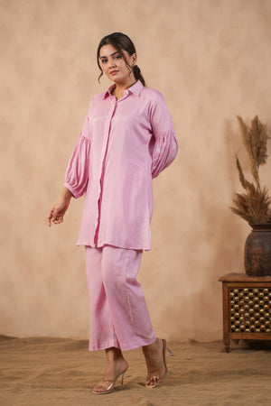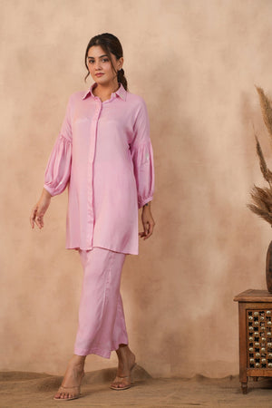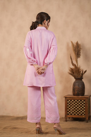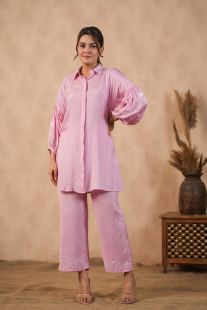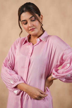 2. Top: Solid Colour Shirt with Floral Embroidered Motifs on Sleeves, Neckline - Shirt Collar Sleeves- Slightly puff sleeves