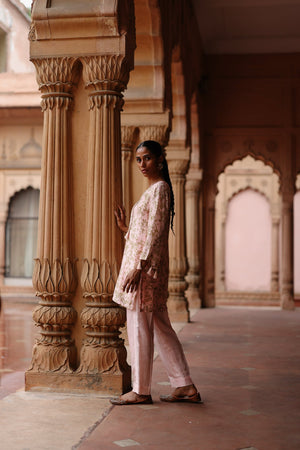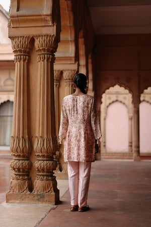 Pink Dupion Silk Printed and Embroidered Short Kurta Set