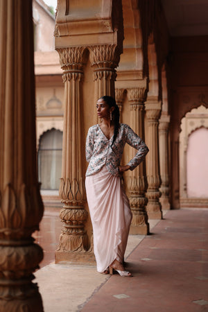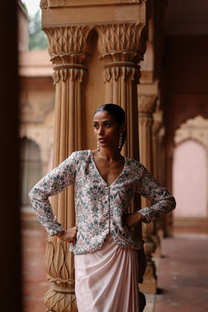 Featuring a floral pastel pink silk peinted jacket paired with solid satin draped skirt