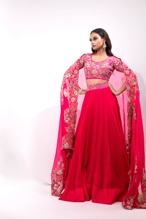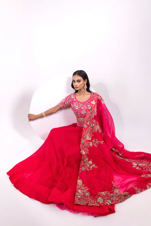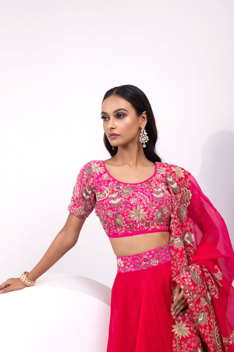 This vibrant fuchsia pink lehenga set, featuring an organza full, flowing lehenga skirt. The outfit includes a matching choli (blouse) with intricate embroidery and a coordinating dupatta. The dupatta is heavily embellished with intricate gold and silver zardozi, sequin, chid and thread embroidery, adding a dramatic and elegant flair to the ensemble.