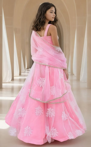 Adorn yourself in delicate elegance with our Pink Embroidered Lehenga Saree, a timeless ensemble designed to make you stand out. The pink choli, crafted with soft lining, a round neck, and back hook eye closure, is embellished with intricate lace finishing for added allure. Paired with a shimmer embroidered net saree, finished with lace and tassels. The easy-to-wear design and flowy drapes showcase a flattering fit, making it perfect for weddings, parties, or any special occasion where you want to make a lasting impression. Let your style shine with this enchanting ensemble that combines effortless elegance with timeless charm.