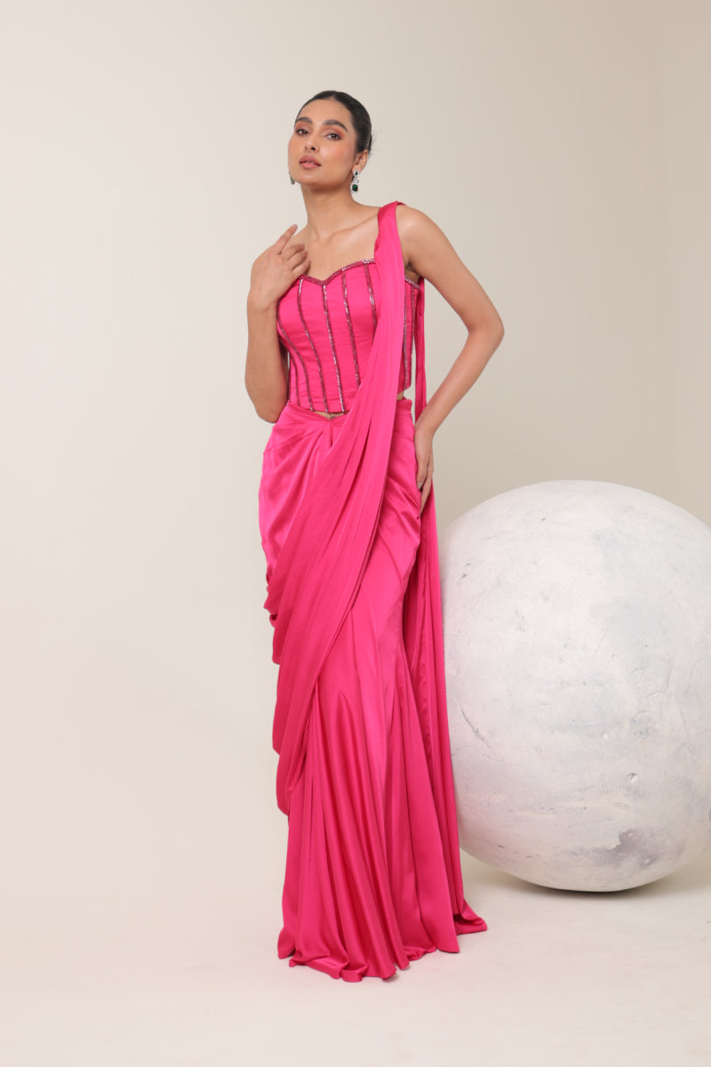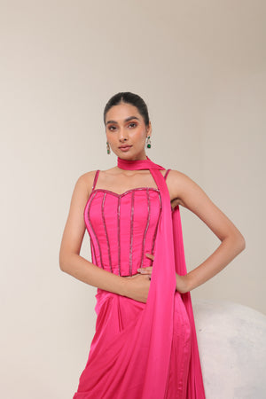 Command the spotlight in our Pink Corset Saree — a sculpted silhouette that marries structure with fluidity. Designed in luxurious fabric, the corset contours the body with precision, while the pre-draped saree cascades effortlessly for a modern, yet timeless appeal. With refined gathers and a cinched waistline, this ensemble is your go-to for elevated celebrations and unforgettable entrances.