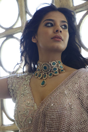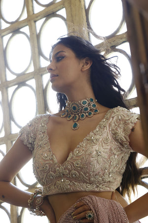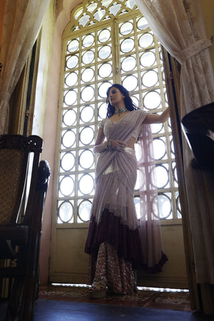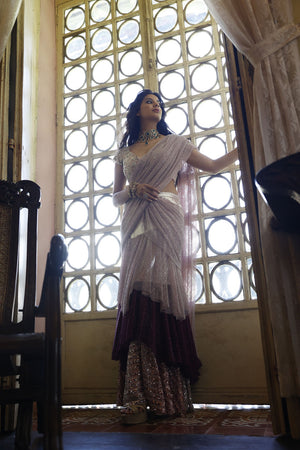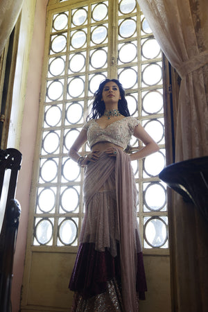 Fabric: Saree: Bask- shimmer lycra, layer 1- mesh, layer 2- Net with sequins, layer 3- silver pleated texture, Drape- mesh with sequins net frill | Choli: Net and shimmer lycra