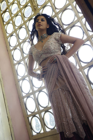 Saree: The pink saree has three different layeres. The sareee bask is the shimmer lycra with attached first layer of mesh fabric, the wine pleated sequins on net is the second layer and the last layer is silver and pink sequins on net of the skirt with mesh drape attached from the waist with sequins frill for finishing on the end of the drape | Choli: Pink pan neckline hand embroidered choli with cutwork embroidered neckline and sleeves on net with diamond stone, sequins and cutdana embroidery.