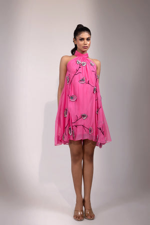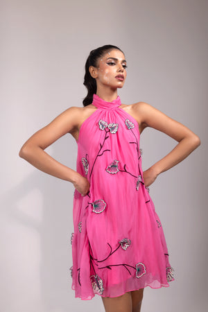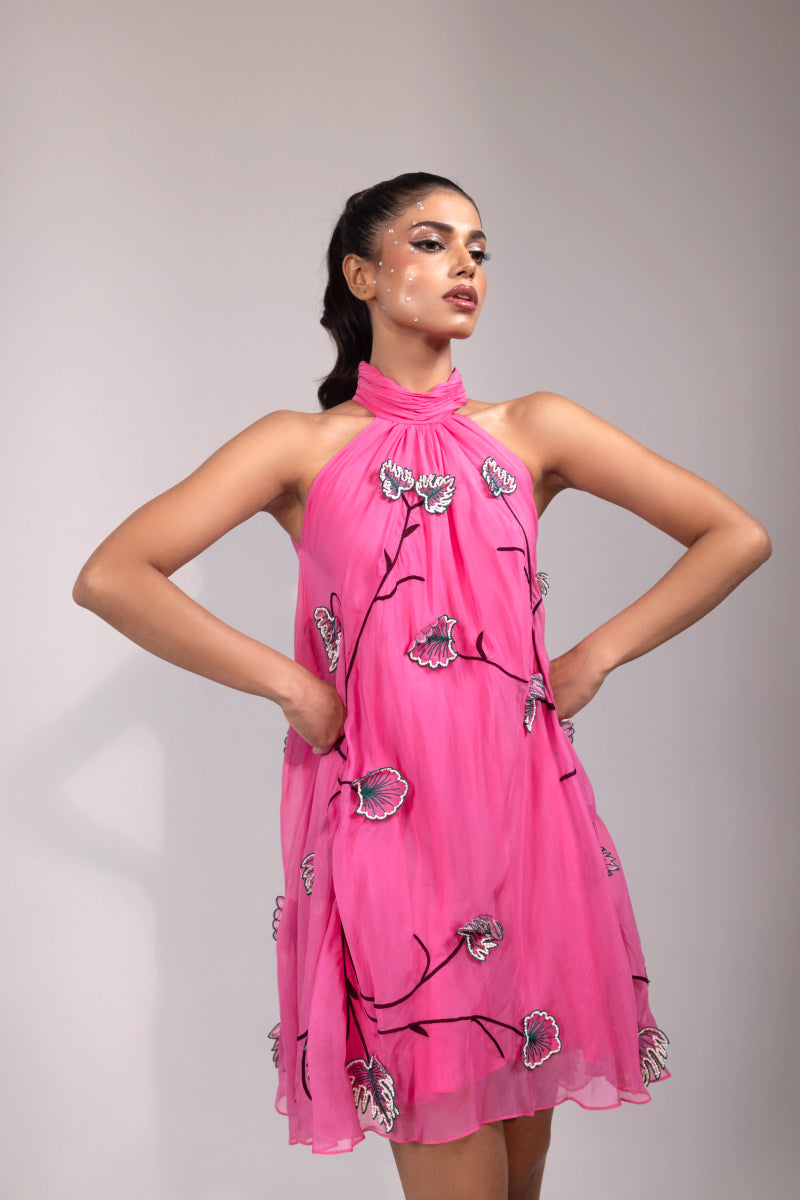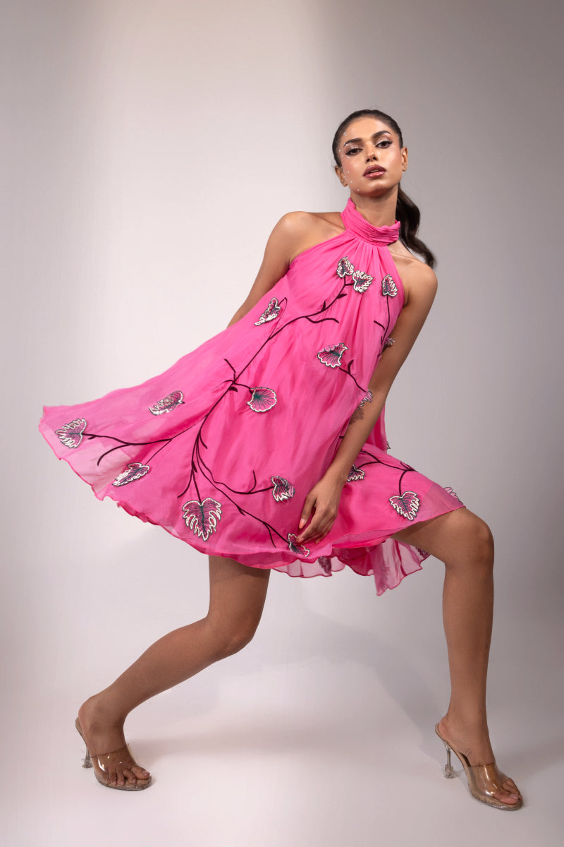 This exquisite hot pink organza dress is a true statement piece, featuring delicate 3D leaf appliqués that add depth and artistic movement. The high neckline and flowy silhouette create an elegant, feminine look, while the sheer organza fabric lends a dreamy, ethereal quality. Perfect for soirées or festive occasions, this dress is a blend of modern craftsmanship and whimsical charm, designed to make every moment feel special.