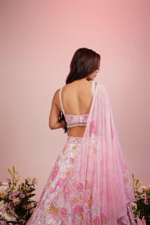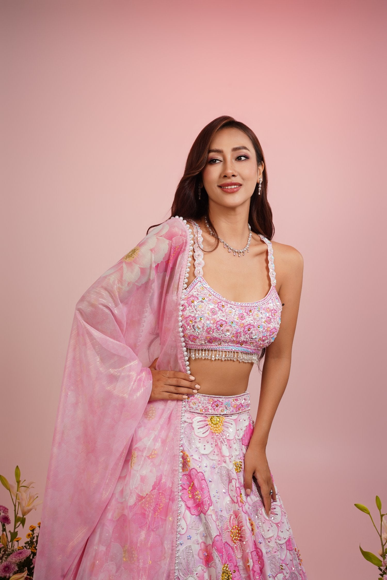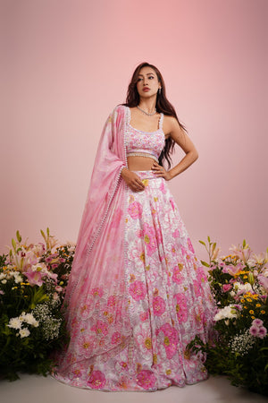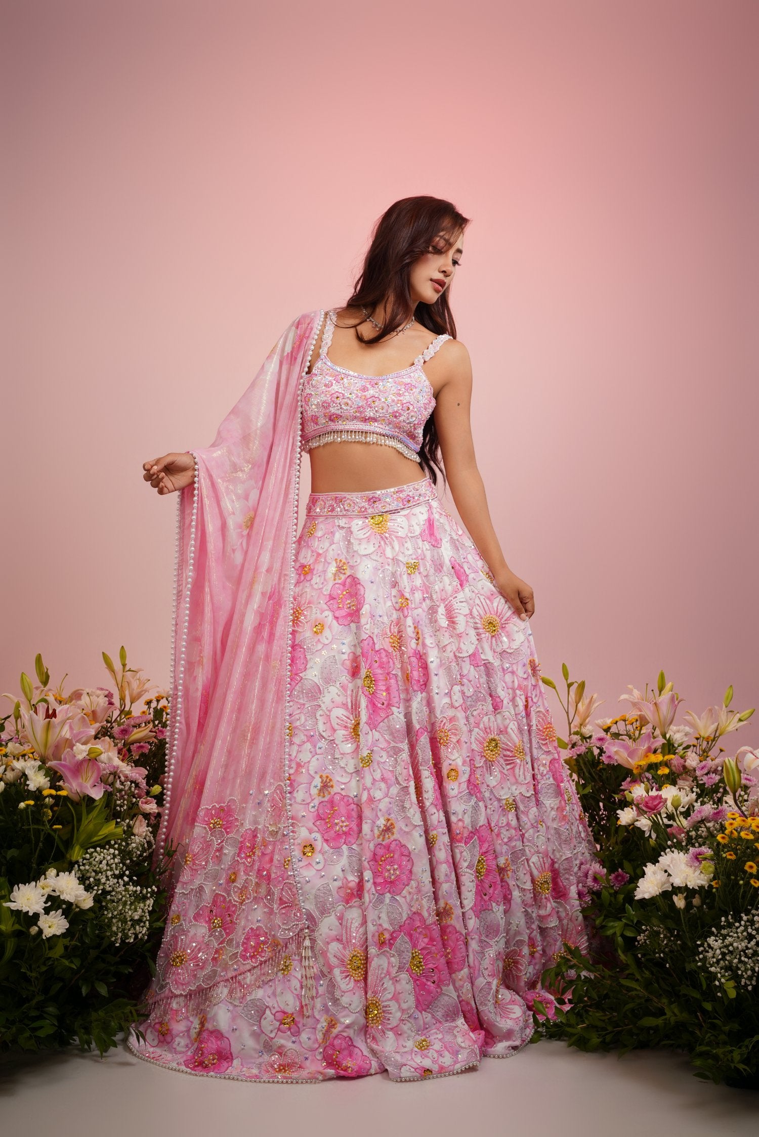 This pink flower lehenga set is paired up with embroidered blouse, net embroidered lehenga and Georgette dupatta looks great to own for any occasions for Indian festivals and functions.