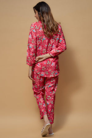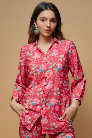 Featuring a pink shirt in french crepe base with print. It is paired with matching pants.