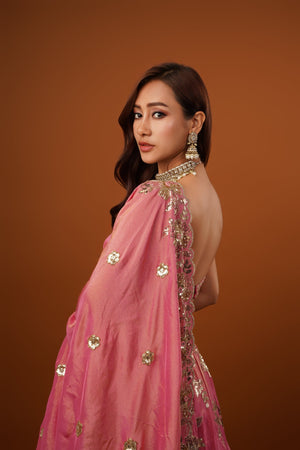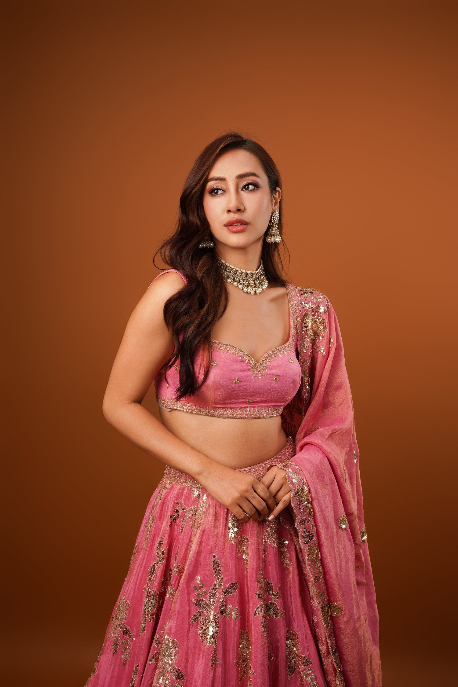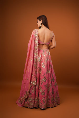 Featuring a pink gold lehenga in tissue base with seuins and hand embroidery. It is paired with embroidered blouse and a dupatta . Accentuate it with statement jewellery and heels for a festive occasion or wedding ceremony.