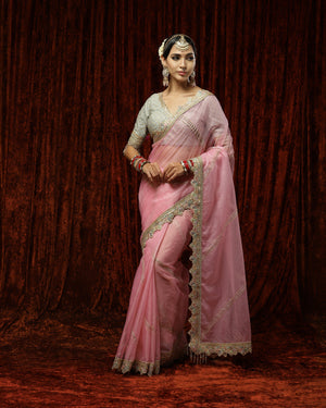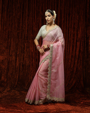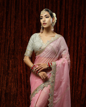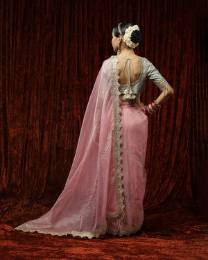 Thes is a beautiful Pink & Gray organza saree with exquisite detailing of Badla and Kasab work and Hyderabadi micro pearls. This saree is paired with a Gray blouse with rose gold gota, pearl and crystal drop detailing. This blouse beautifully complements the saree providing the outfit a classic look!