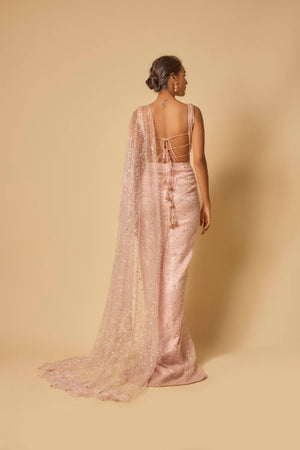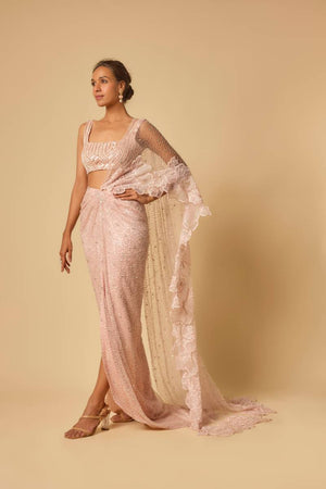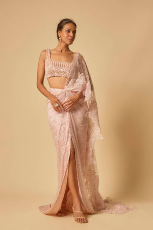 featuring pink heavy embroidered drape saree with cutwork patch detailing in tulle, with embroiderdblouse in mashroo silk
