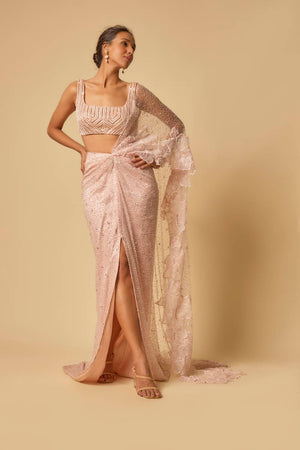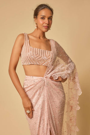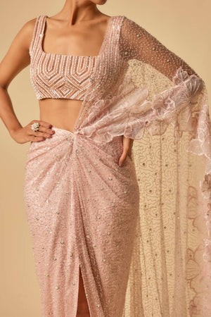 Pink Heavy Embroidered Pre-stitched Drape Saree with Embroidered Blouse