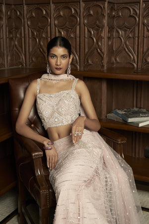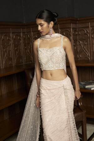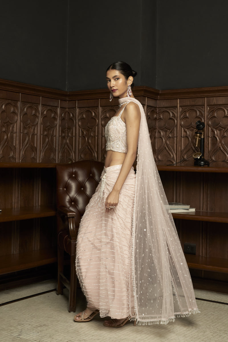 Pink drape skirt and blouse with silver cutdana sequens embroidery, paired with a stole dupatta.