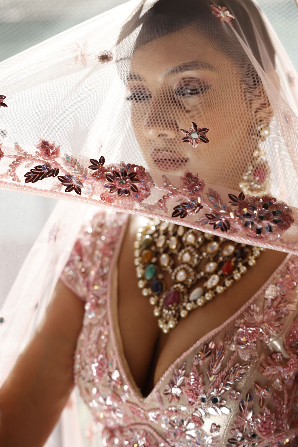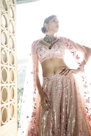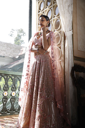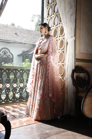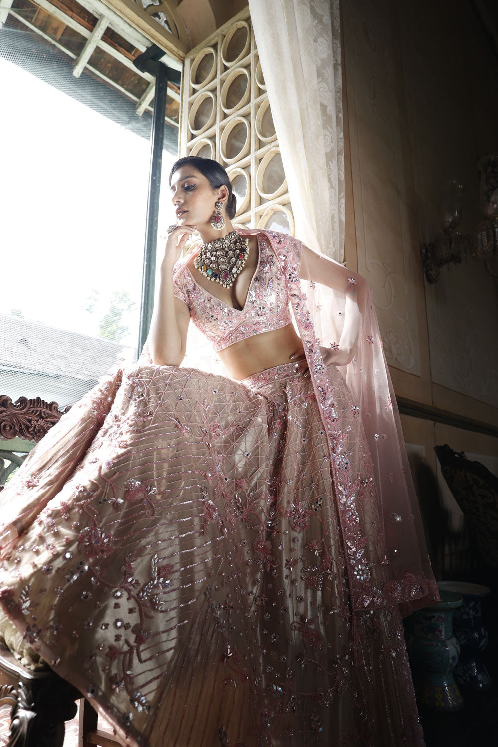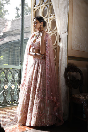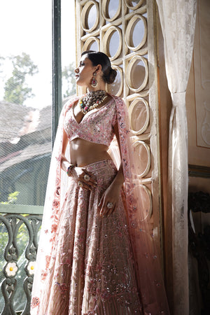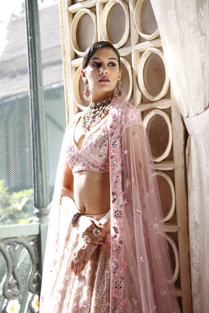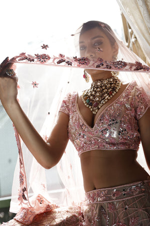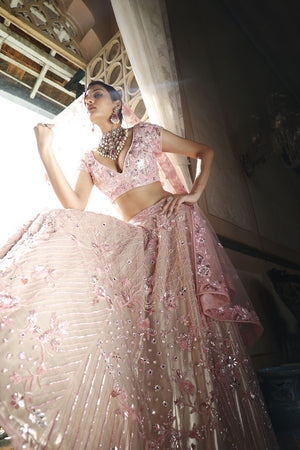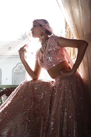 Lehenga: Pink net lehenga with modern work all over in abstract form with 2" embroidered waistbelt with shimmer lining | Choli: Pink net choli with pan shape neckline and cap sleeves have modern work all over in abstract form all over with shimmer lining and back tieup dori with tassels for finishing | Dupatta: Pink net dupatta with floral border and small and big butti all over with tassels for finishing.