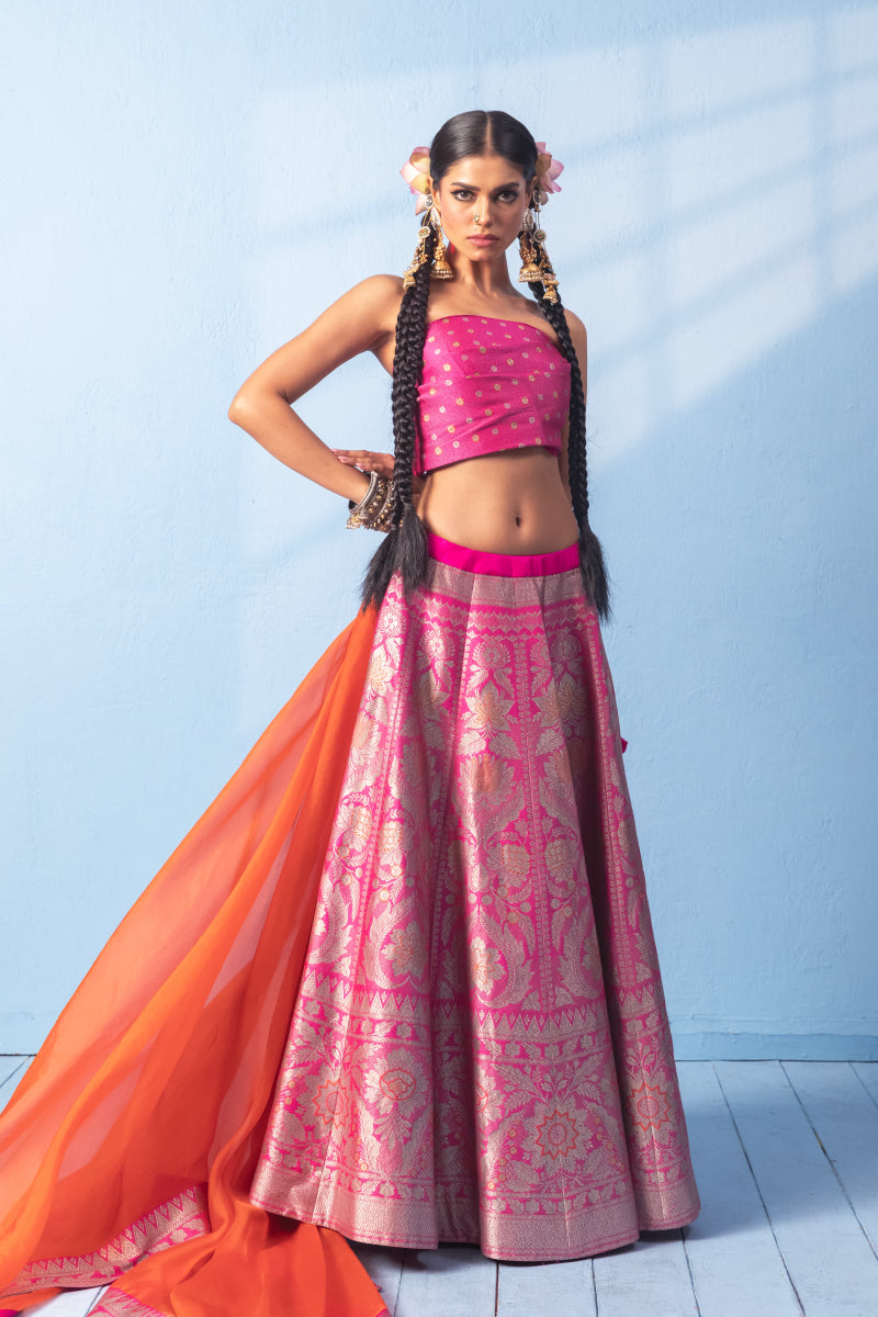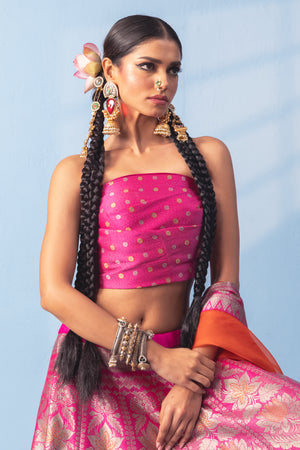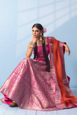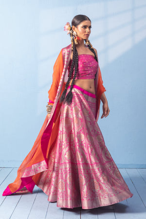 Pink Meenakari Banarsi Silk Lehenga With Organza Duppatta And Unstitched Blouse Piece
