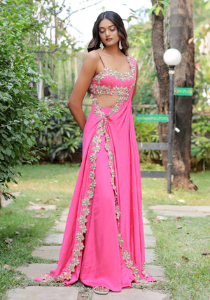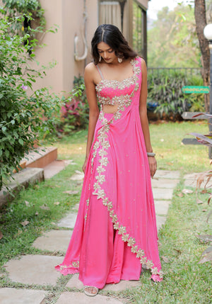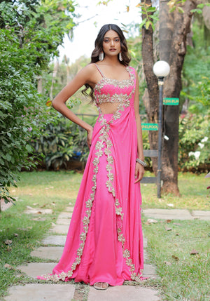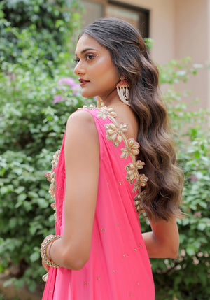 The Pink Pant made from a Natural crepe fabric.The Blouse Is Adorned With Intricate Cowrie And Mirror work Embroidery. To Complete The Ensemble, A Long Cape Is Added.