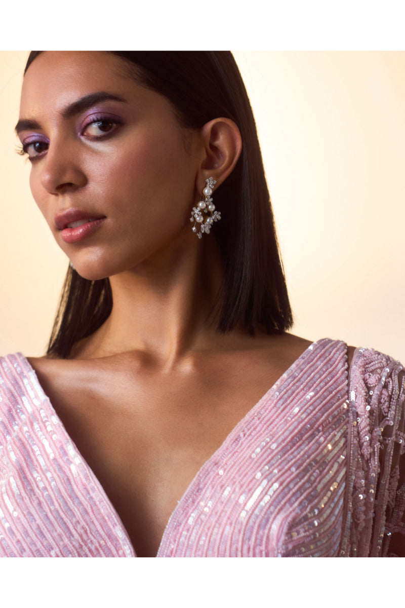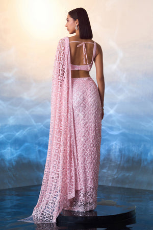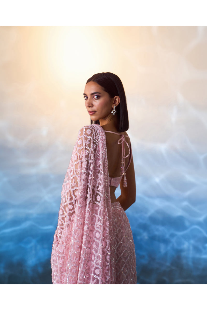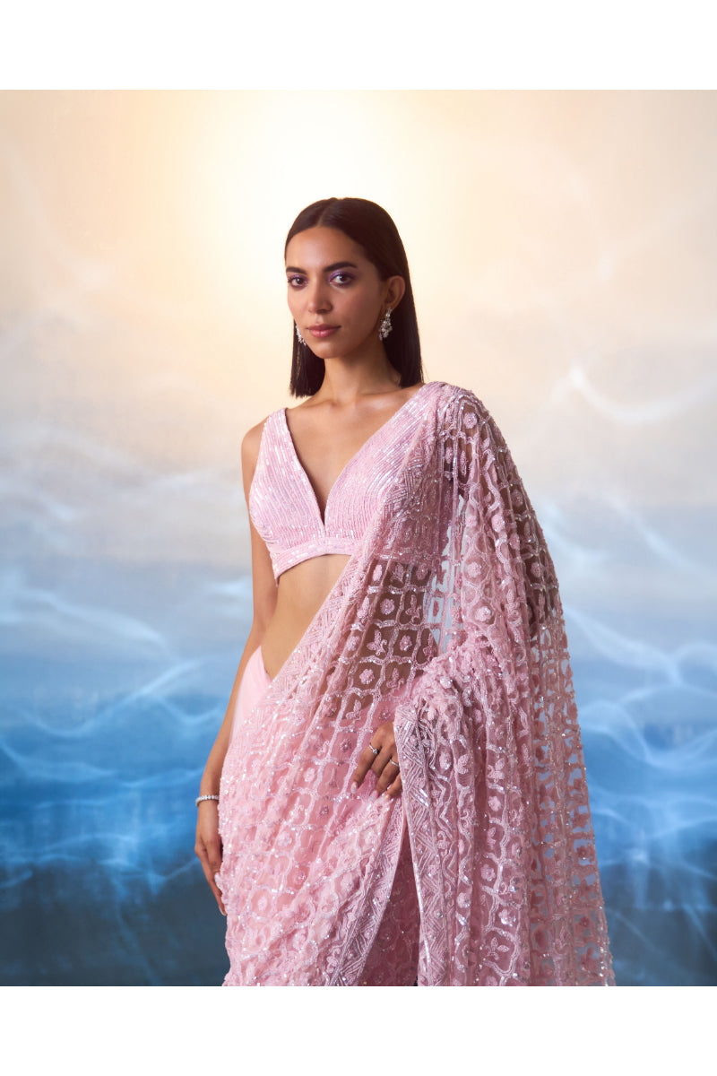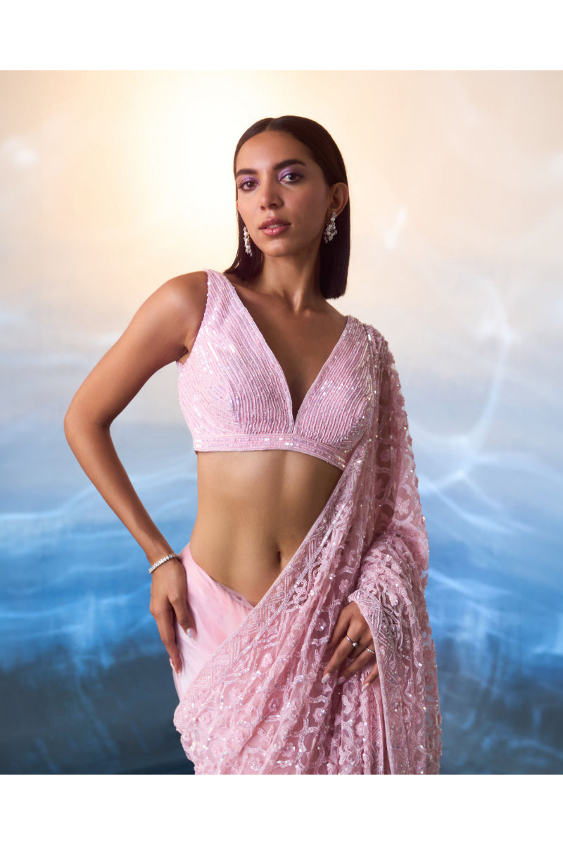 A pink net saree hand embroidered with tonal sequins, cystals and glass bugle beads.