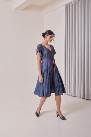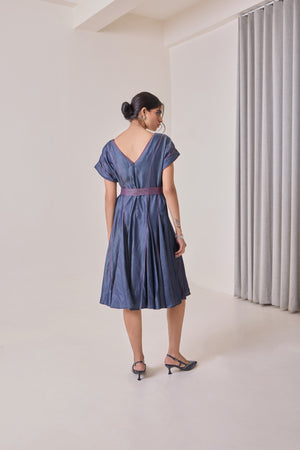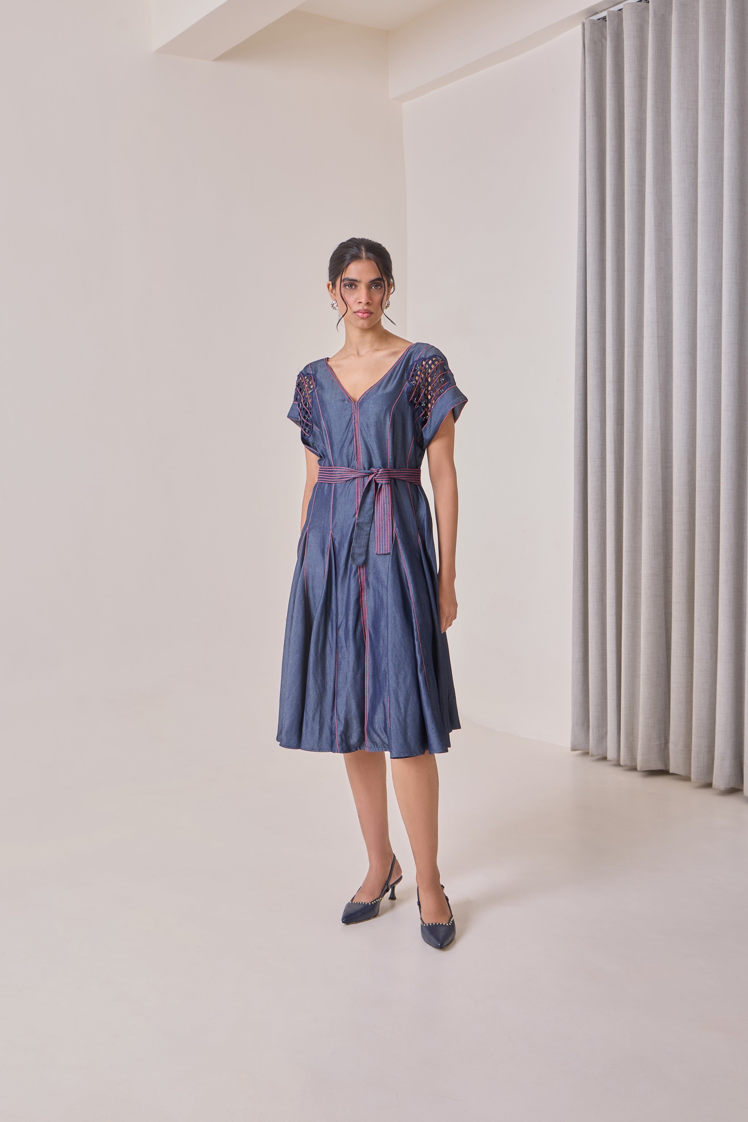 A paneled denim midi dress in 100% Tencel, finished with contrast pink topstitching and floral cutouts at the shoulders. The skirt part is flared and voluminous, designed with generous fabric for dramatic movement and a universally flattering shape. Comes with a matching pink-stitched belt for added definition — an effortless statement from brunch to night out.