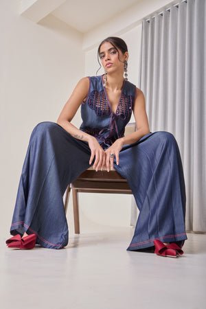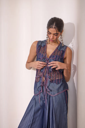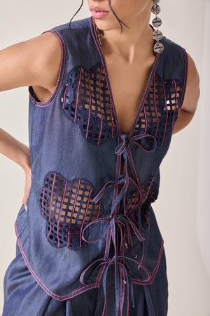 A statement denim vest crafted in 100% Tencel, featuring playful pink topstitching and laser-cut floral cutouts. Can be worn on its own for a bold party look or layered over tees, shirts, or dresses. Versatile, youthful, and designed for comfort — pairs effortlessly with the matching flared pants or anything in your wardrobe.