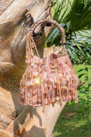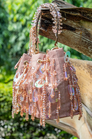 Inspired by traditional bags, Artisans in India and shaped to a lightweight structured form crystals Potli bags