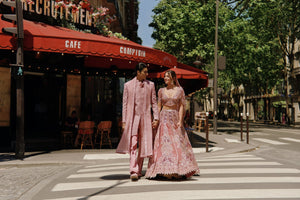 Pink Sherwani Set, adorned with intricate hand crystal work embroidery. Crafted from raw silk, the sherwani exudes regal charm, complemented by a linen silk kurta and pant. Complete your ensemble with a delicate organza dupatta