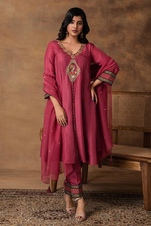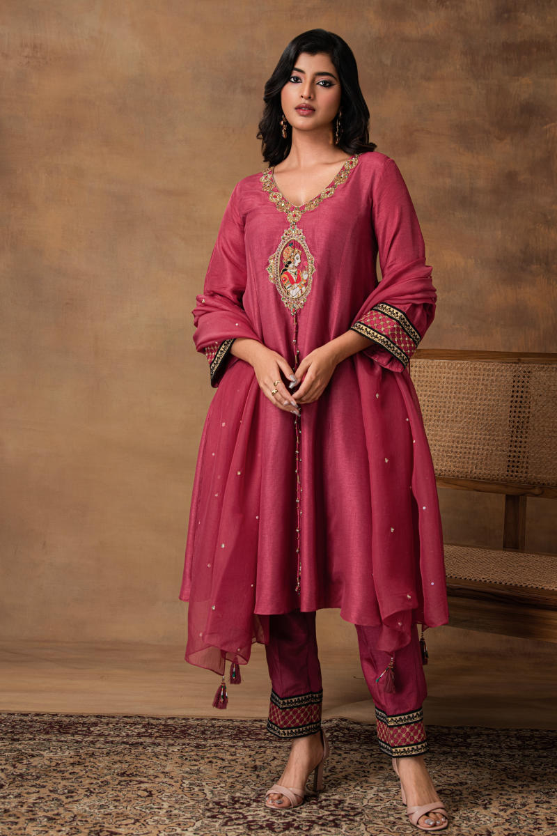 Featured here is silk Kurta set in pink hue, cut in an easy, fluid silhouette. Adorned with our signature dori-marodi and resham embroidery — a fine craft rooted in regal Indian techniques. The neckline is crowned with a statement Begum motif, inspired by vintage palace portraits. Sleeves and pants feature gota patchwork and light embroidery that creates a look of jharoka’s. The set Comes with a featherlight embroidered organza dupatta, delicately finished to add an ethereal layer to your look. Whether you’re dressing for a festive brunch, puja, or a pre-wedding gathering, this set delivers all the drama — minus the weight.