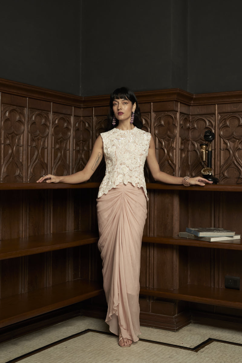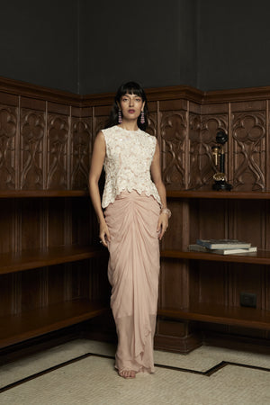 Pink organza hand embroidered top with ivory work paired with chinon draped skirt.
