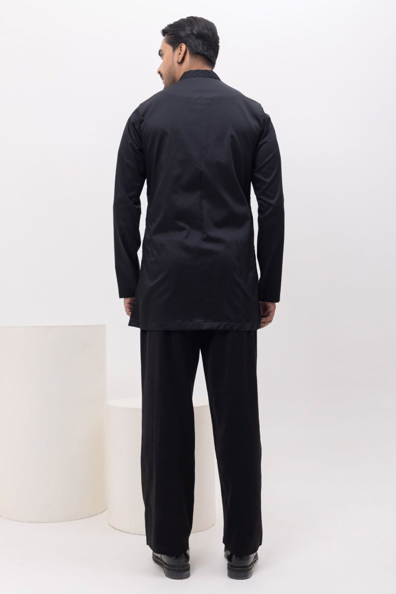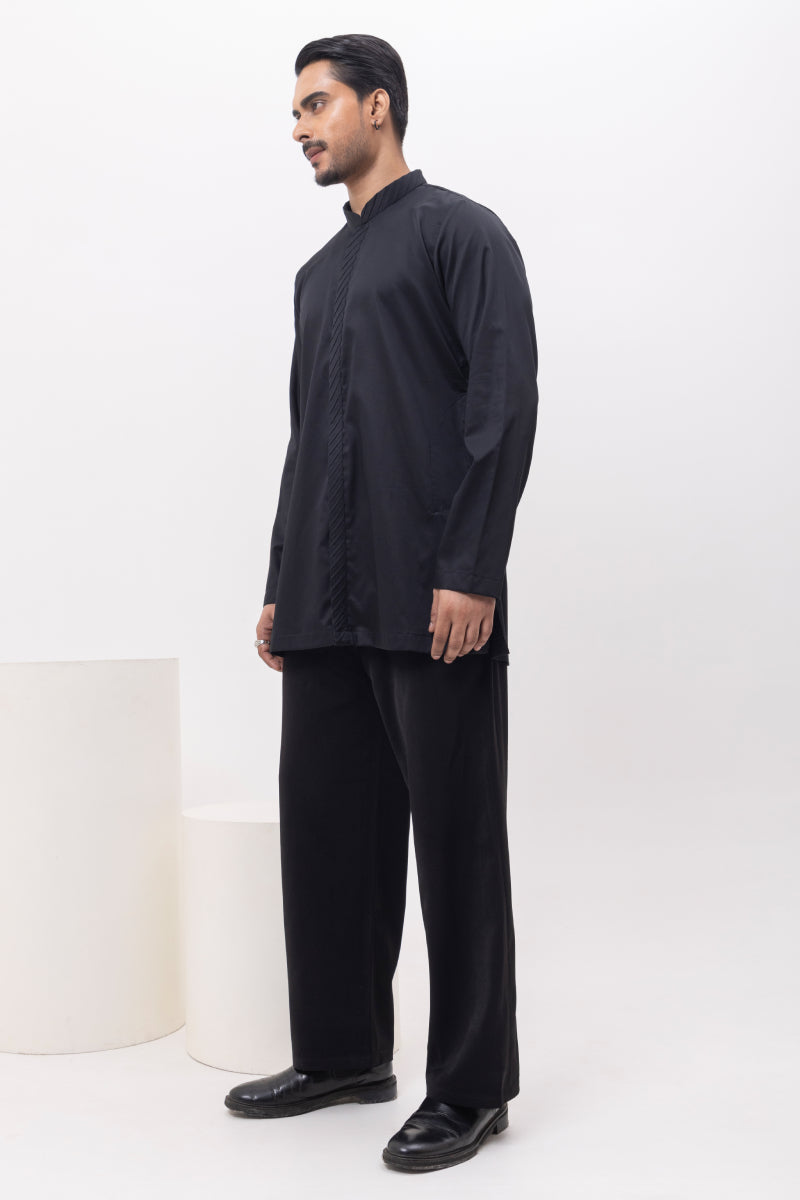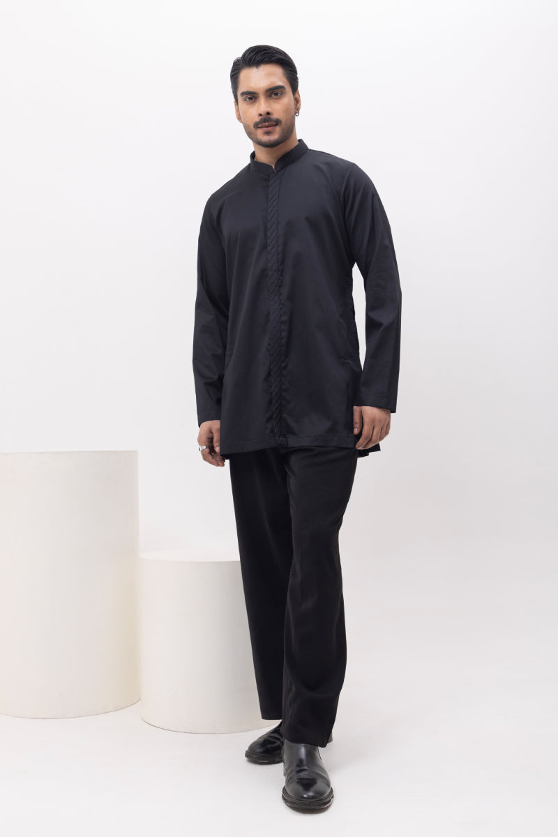 A Classic plain black kurta with detailing in front, you cant go wrong with when you want to make a statement! comfort like shirt , looks like kurta! best of boh world!