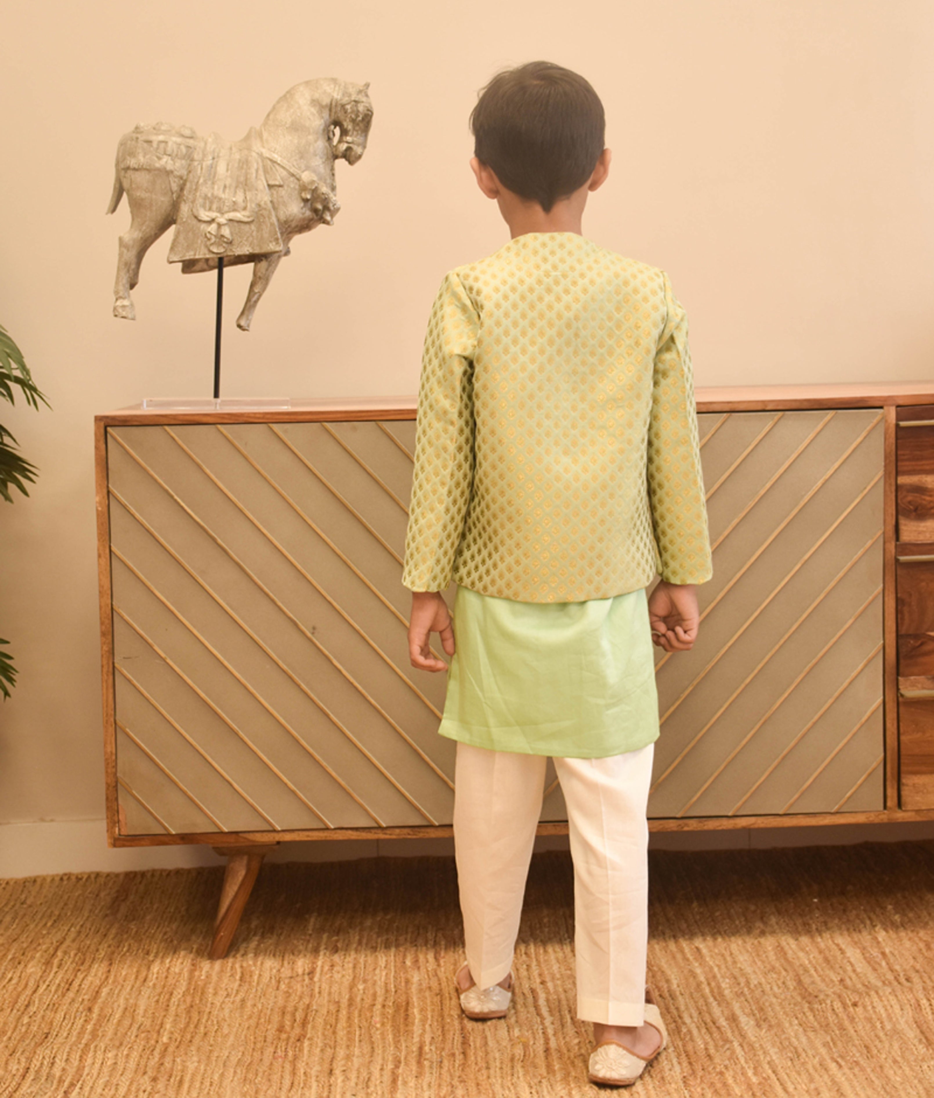 Dress your young gentleman to perfection for those special occasions with our exquisitely crafted ensemble. This set includes a charming green brocade jacket, an elegant ombre cotton silk kurta, and a stylish off-white pant, creating a sophisticated look that's perfect for wedding or pre-wedding festivities. Let him make a lasting impression with this impeccably designed outfit, combining traditional flair with contemporary style.