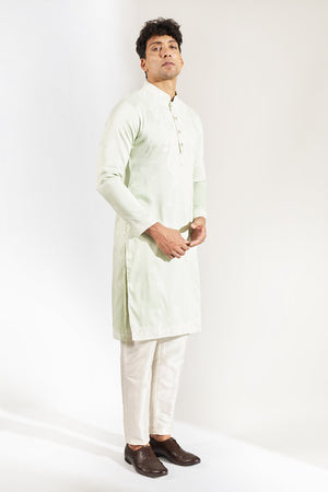 Pista Green crepe silk based kurta enhanced with chikankari embroidery paired with an off white dupion silk based pants.