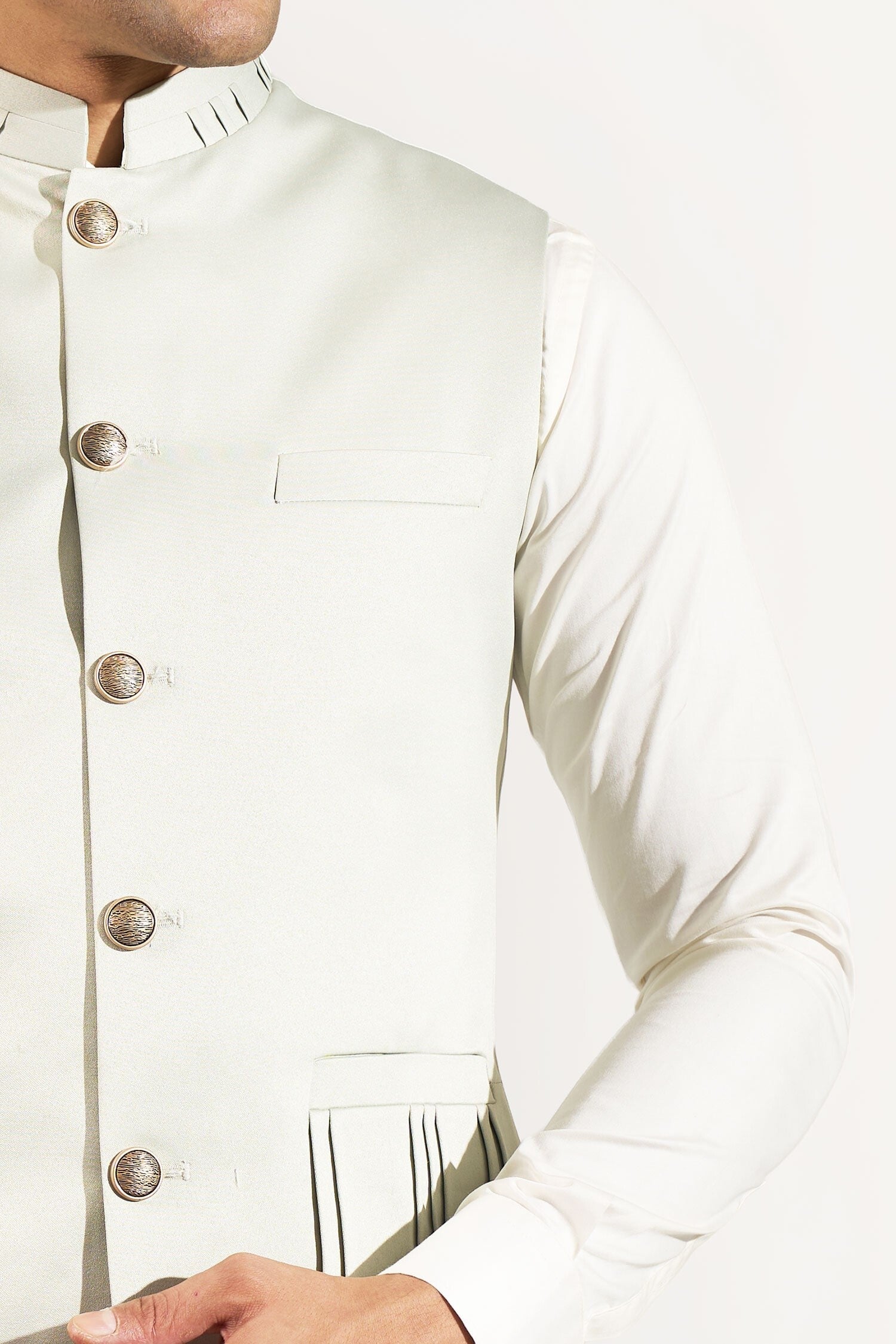 Pista Green French terry based jacket enhanced with pintucks and metal buttons detailing.