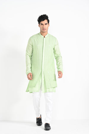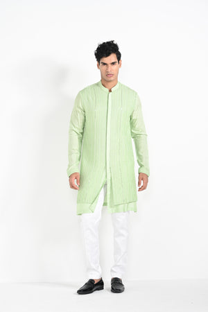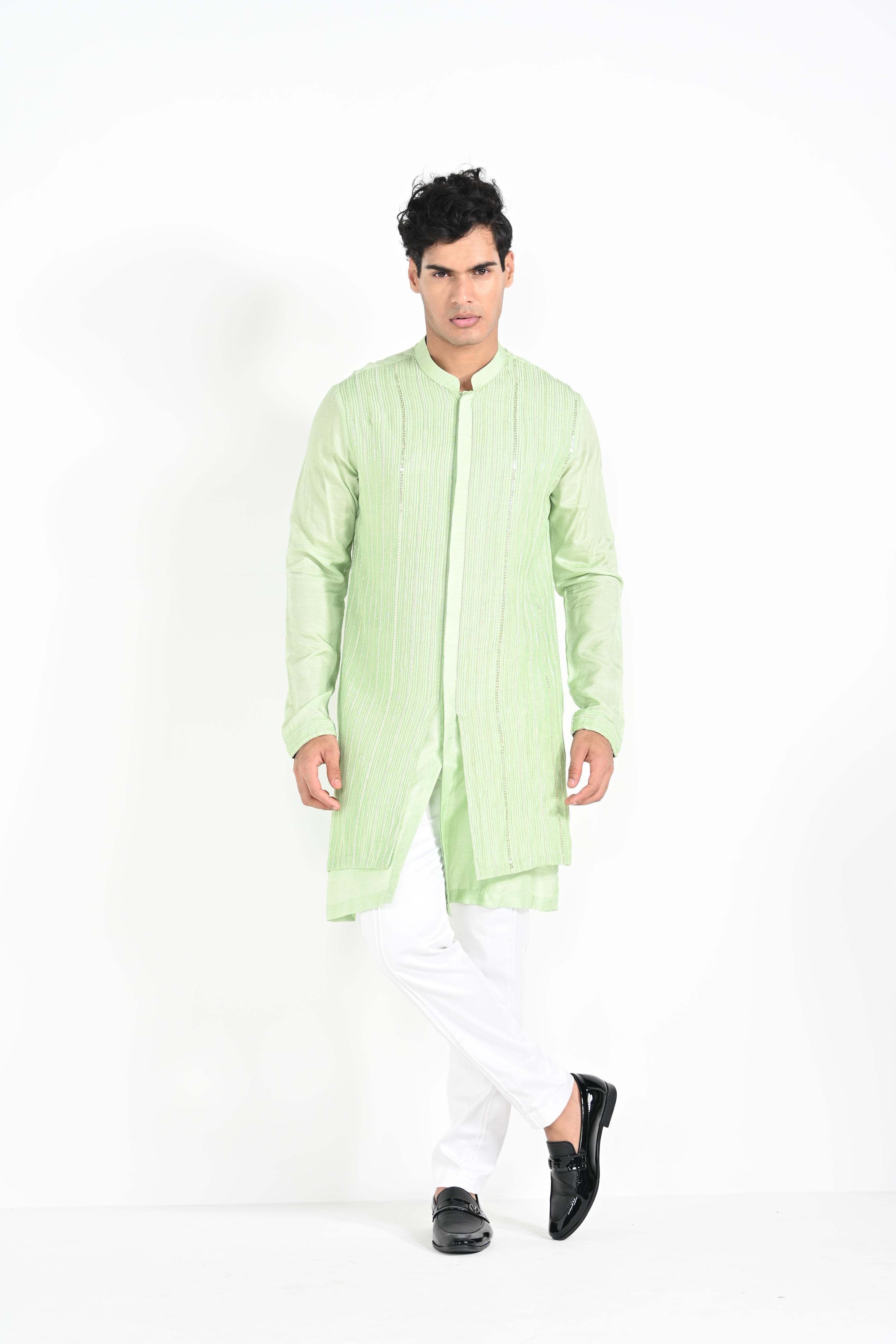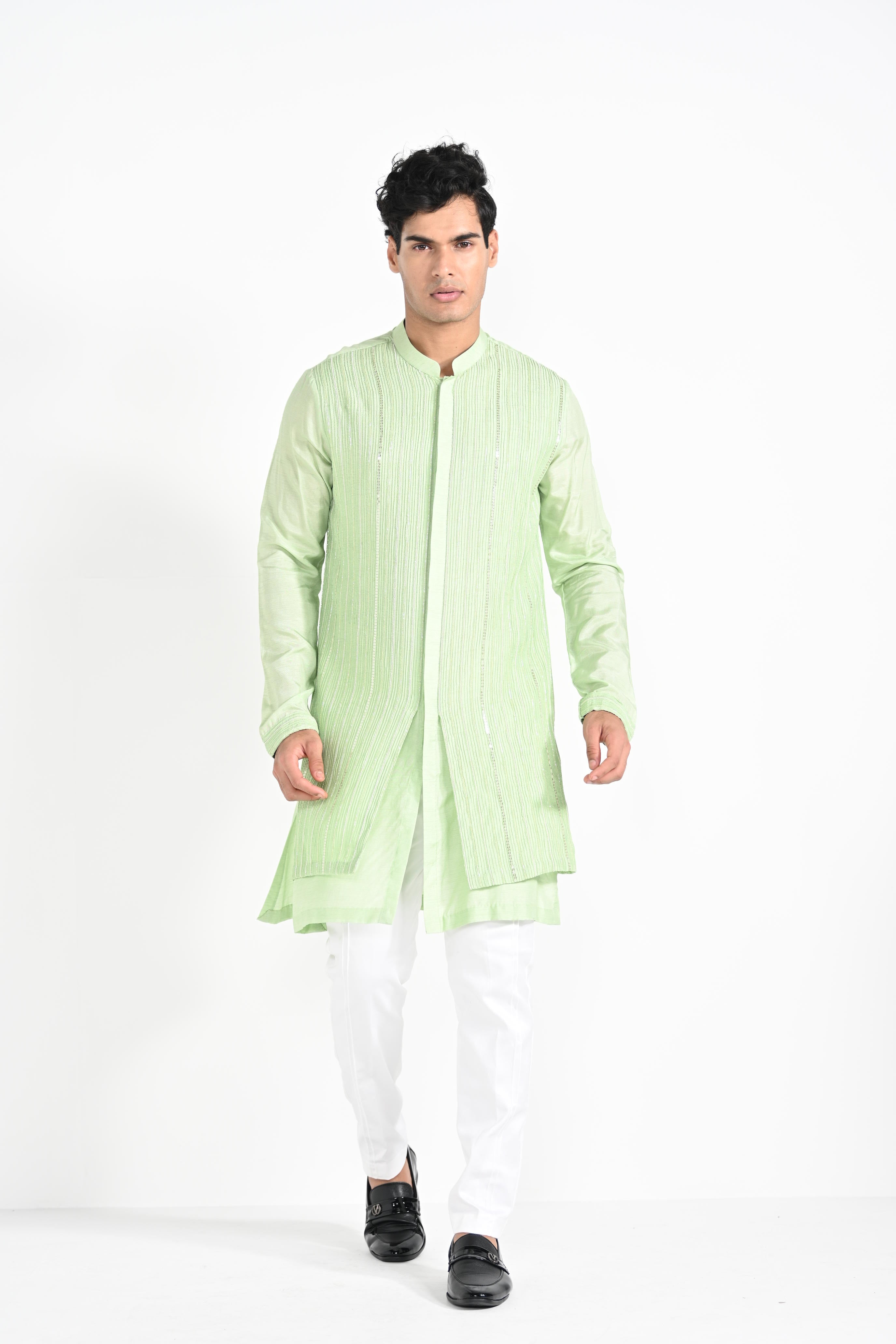 Pistacio Green ,panlled pintucks detailing,cutdana,and sequences work embroidered on bamberg raw silk.Paired with ivory slim fit Pant Pajama. Color of the actual garment may vary due to lighting conditions during the shoot .