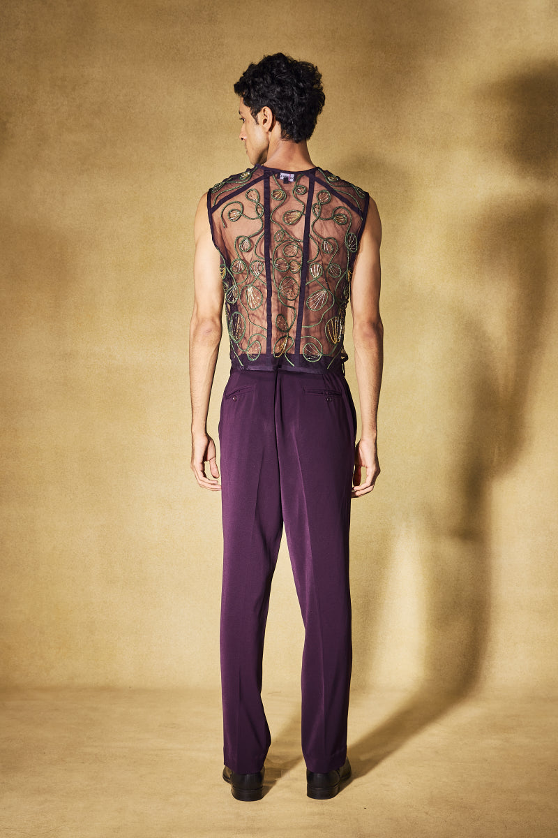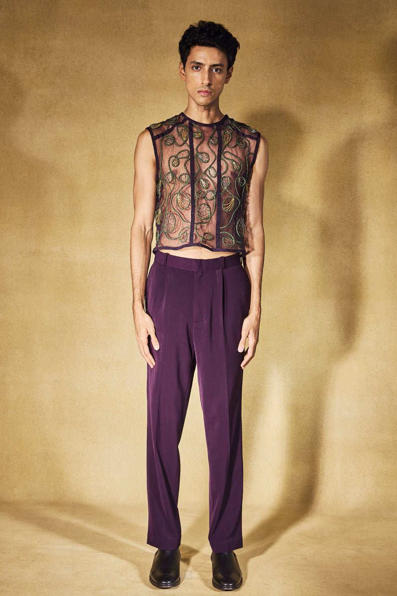 A deep plum set featuring a sheer top with enchanted green cording and minimal embroidery, paired with sharply tailored trousers. Structured, tonal, and subtly detailed, this ensemble redefines evening elegance, luxury menswear with refined, transformative energy.