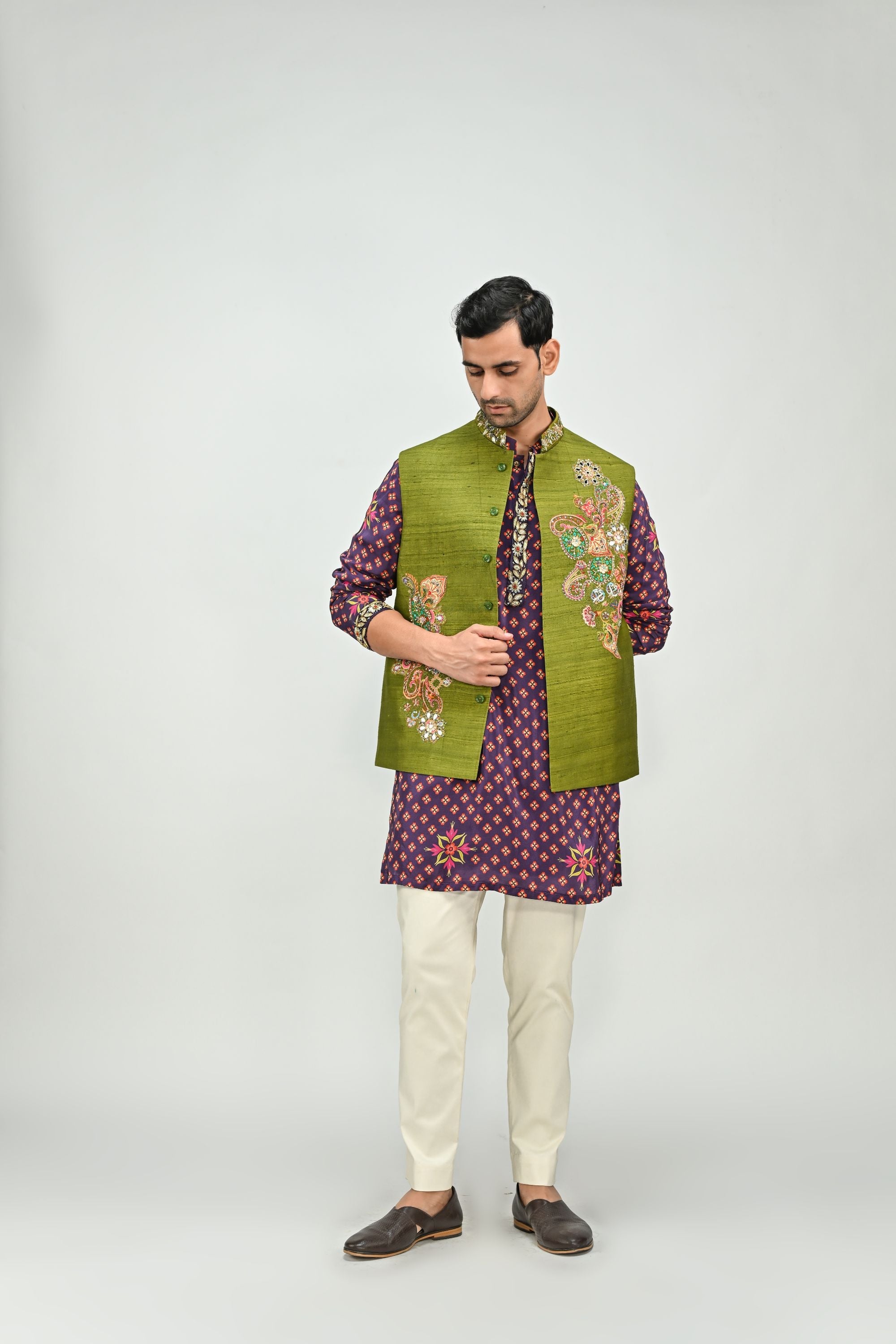 Plum Kurta Paired With Patch Olive Bundi Pant Set