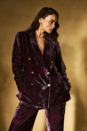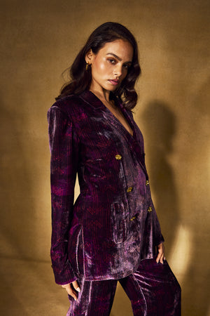 A structured velvet blazer paired with fluid wide-leg pants, printed in a rich deep plum hue with our signature monogram. The silhouette balances precision with ease, where sharp tailoring meets soft movement. An elevated power look, perfect for festive evenings, destination events, and standout dressing.