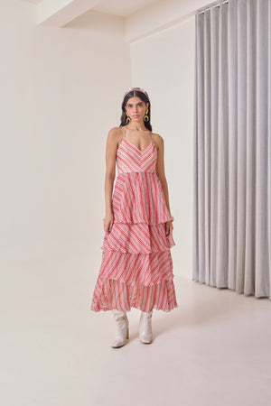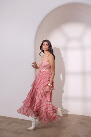 A sweeping vegan silk organza maxi in deep plum, designed with a corset-style bodice and cascading ruffle tiers for full, head-turning drama. The smocked back keeps it easy to wear, the mul lining keeps it soft, and the silhouette works just as well for sundrenched brunches as it does for candlelit date nights. Feminine, floaty, and impossible to ignore.