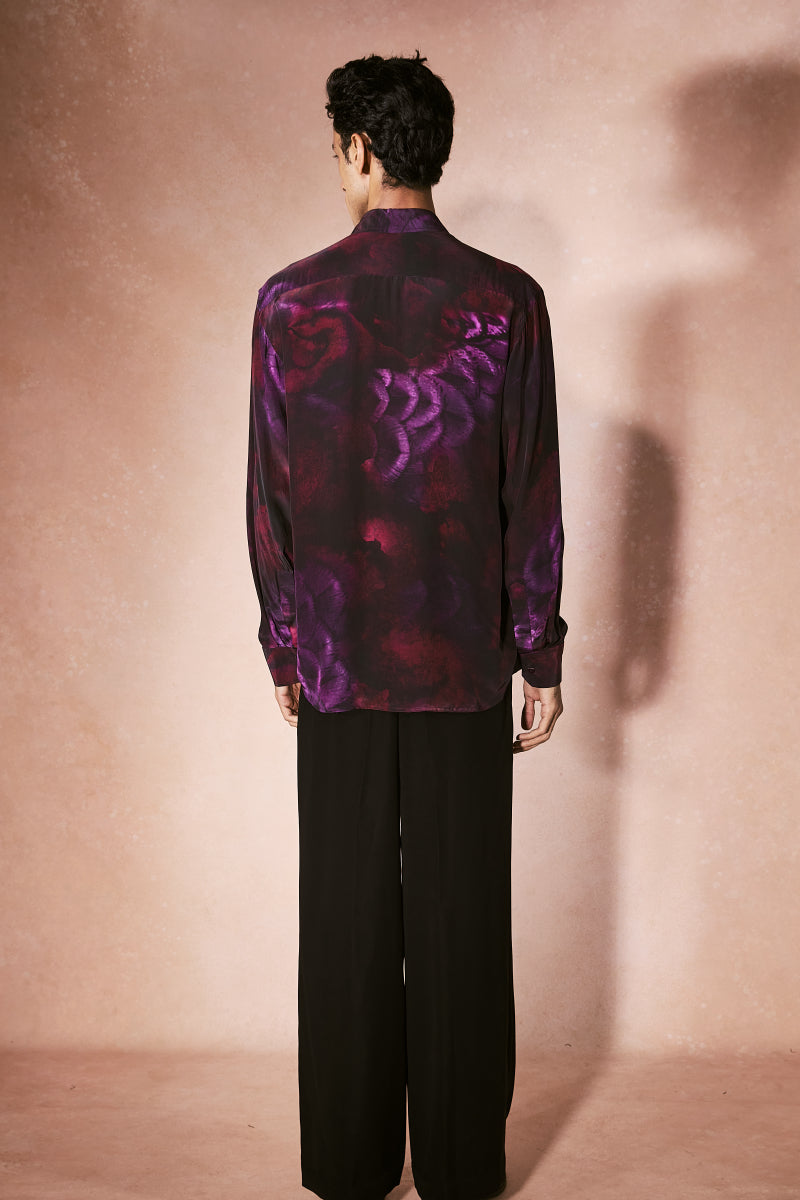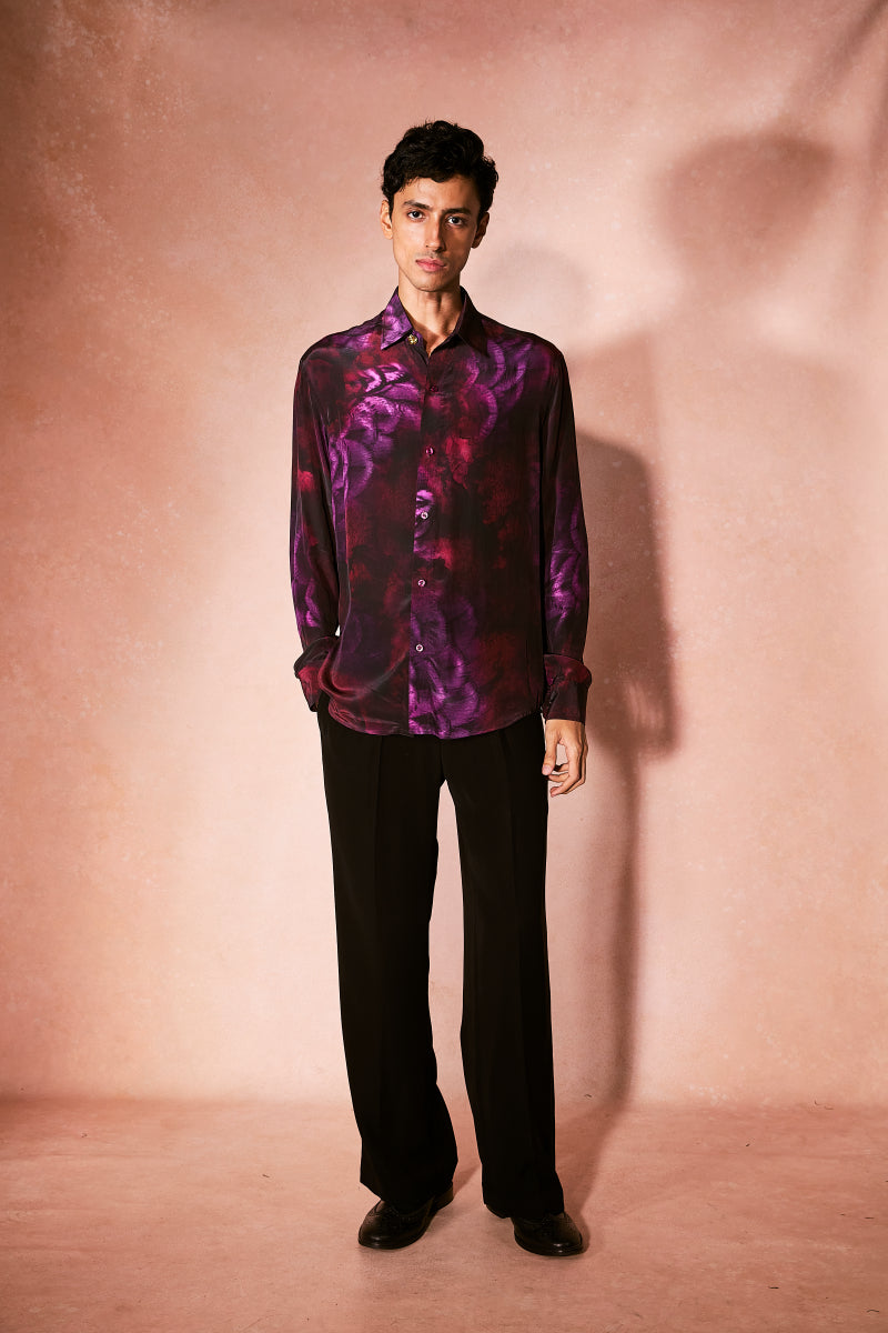 A deep plum full-sleeved shirt tailored for modern elegance, featuring an all-over print that adds depth and visual intrigue. Paired with sharply constructed black trousers, the ensemble balances structured sophistication with expressive detail, making it a statement of luxury menswear for festive evenings, after-parties, and contemporary celebrations