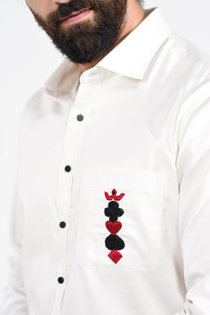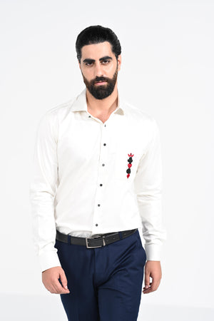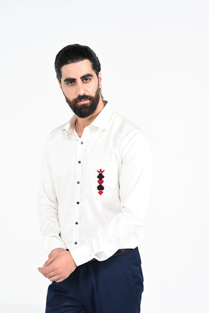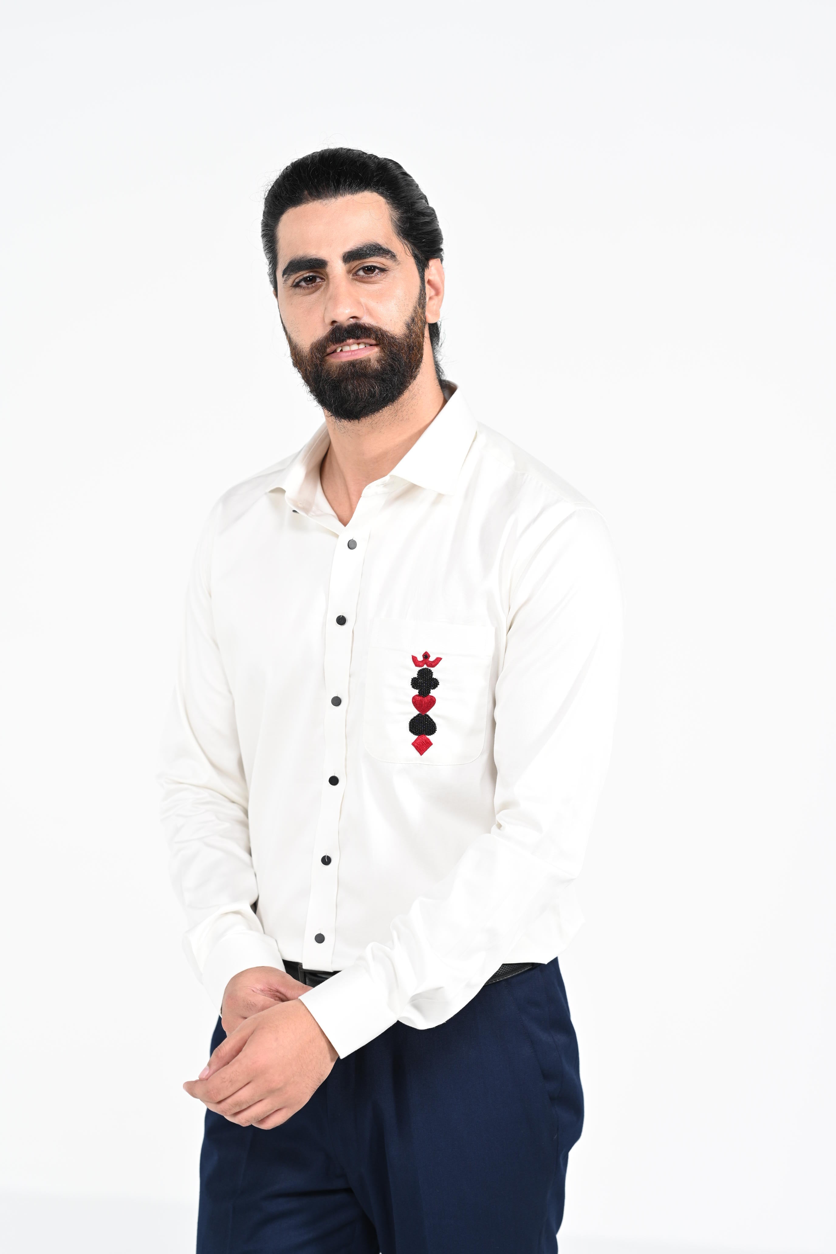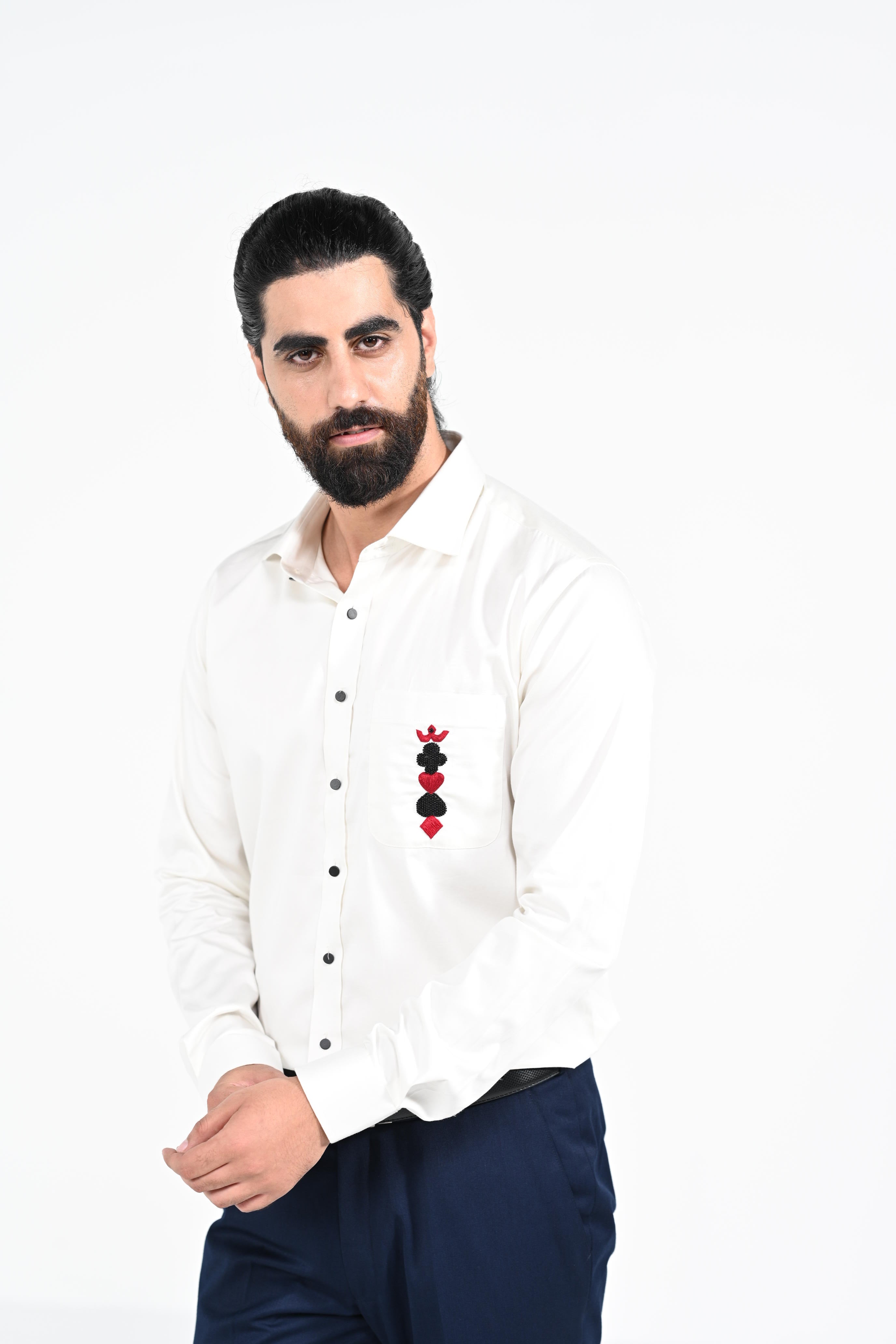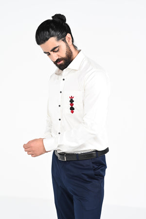 Featuring a White shirt embroidered on pocket with thread and cutdana cotton strech base fabric .This contains only one piece. Color of the actual garment may vary due to lighting conditions during the shoot .
