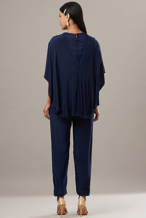 Blue Pancho Top with Trouser Pants in Crepe with Embroidery.