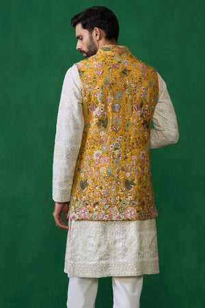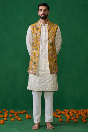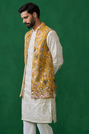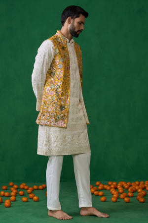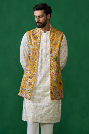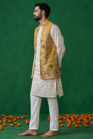 The outfit consists of a long kurta with an embroidered repeating pattern. The kurta is paired with Patiyala trousers, which are wide at the top and gathered at the ankles, creating a pleated, draped effect. Over the kurta, a short, sleeveless jacket is worn, adorned with floral embroidery.