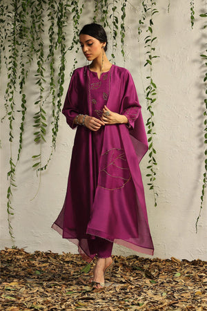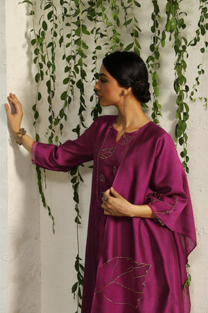 The timelessness of nature inspired motifs is interpreted through hand embroidered leaf motifs in our pop pink relaxed fit kurta set. The decadence is enhanced with our intricate nakshi and zari work.