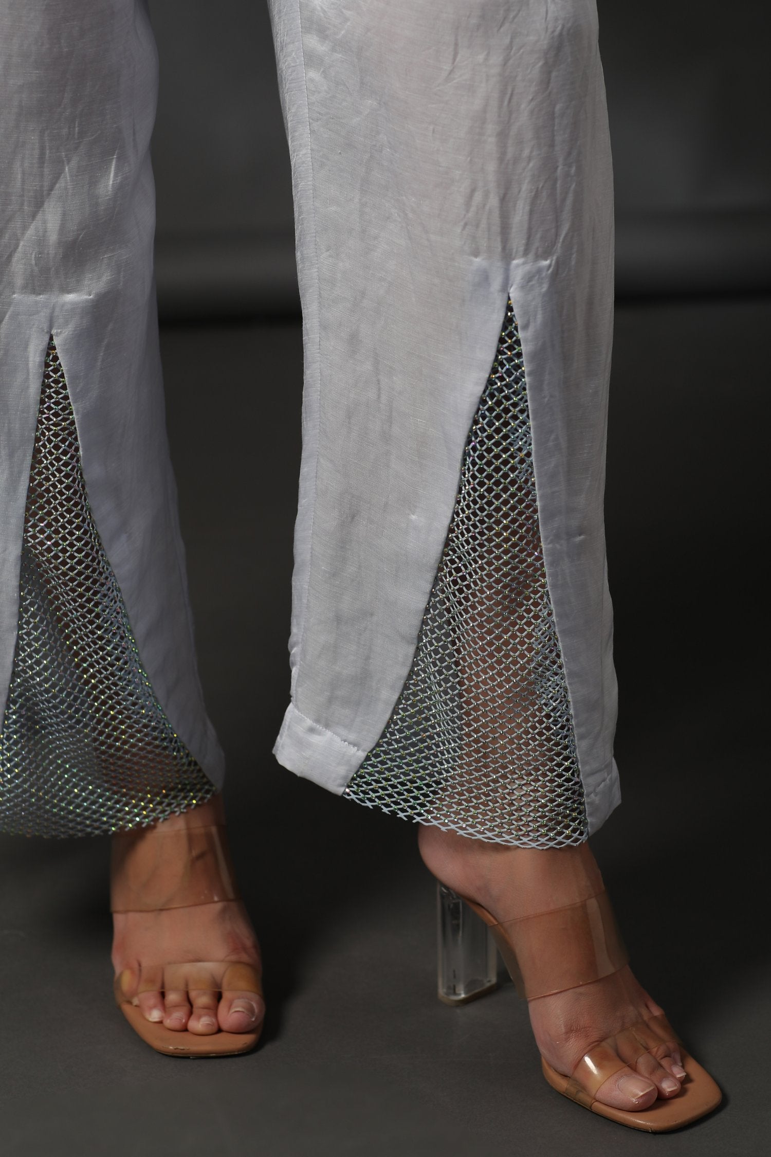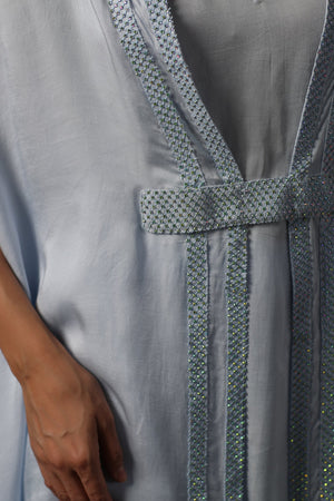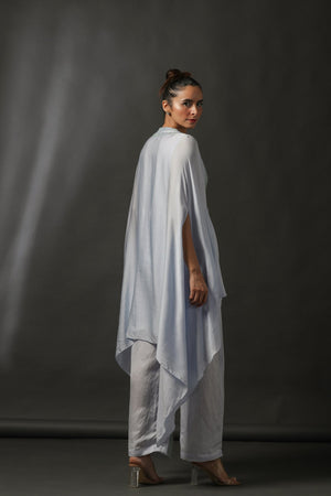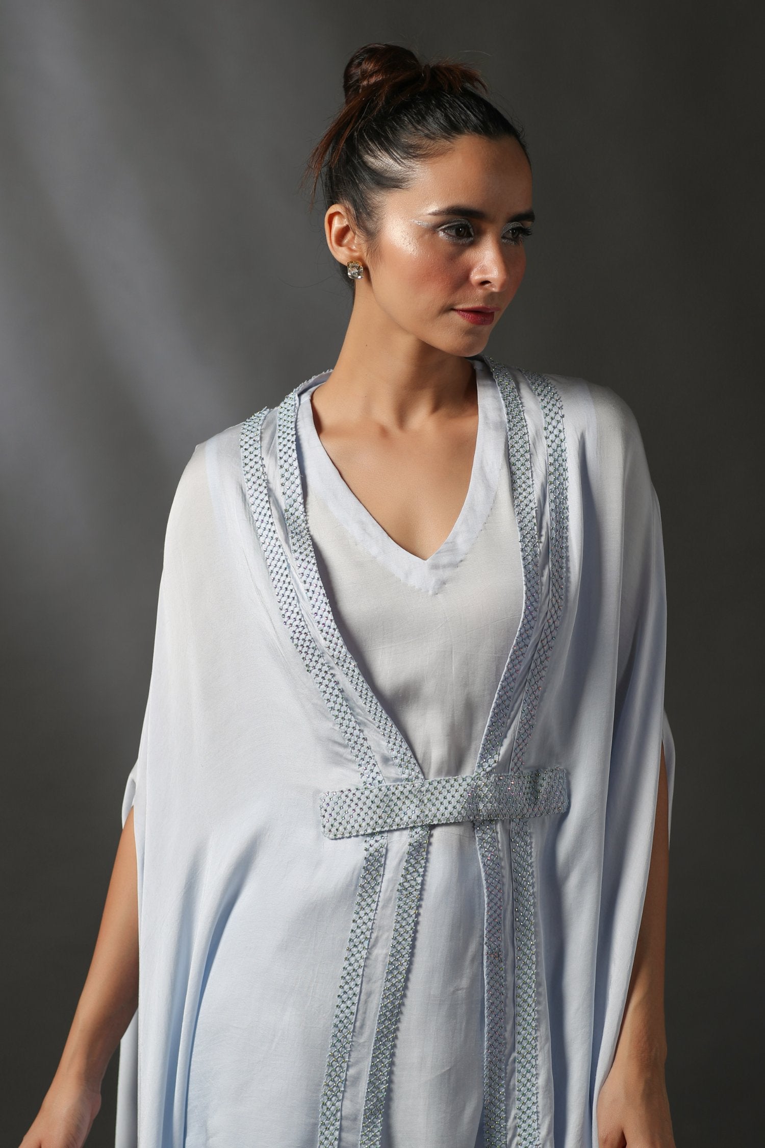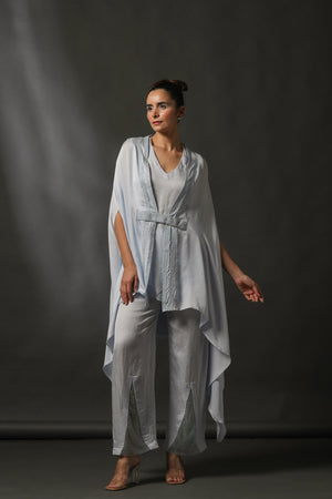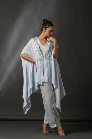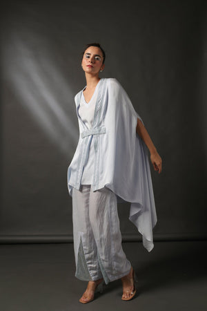 Featuring a Powder blue cape with rhinestone detailing paired with a slip and pure linen pants .
